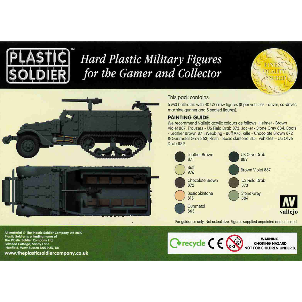 Hard plastic military figures for the gamer and collector. This pack contains five M3 Halftracks with 40 US crew figures (8 per vehicle).