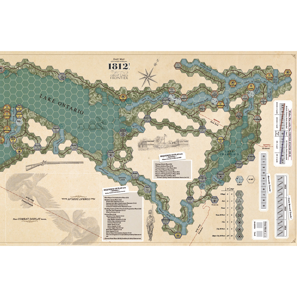 Unit density is small, 288 units over 2 maps at 55 square miles per hex. The playing area is a hex-based with a point-to-point feel encompassing the three primary battlegrounds of: Lake Erie, Lake Ontario, and Lake Champlain. There are no overly complicated systems or tables allowing quick and intuitive game play. The game scenarios range from a single map with each player holding one hand of 8 Strategy cards with a 1.5 hour playing time up to the full 2-map, nine-hand campaign averaging a 9 hour playing time. All of the scenarios and the full campaigns are highly re-playable with new experiences in each playing.