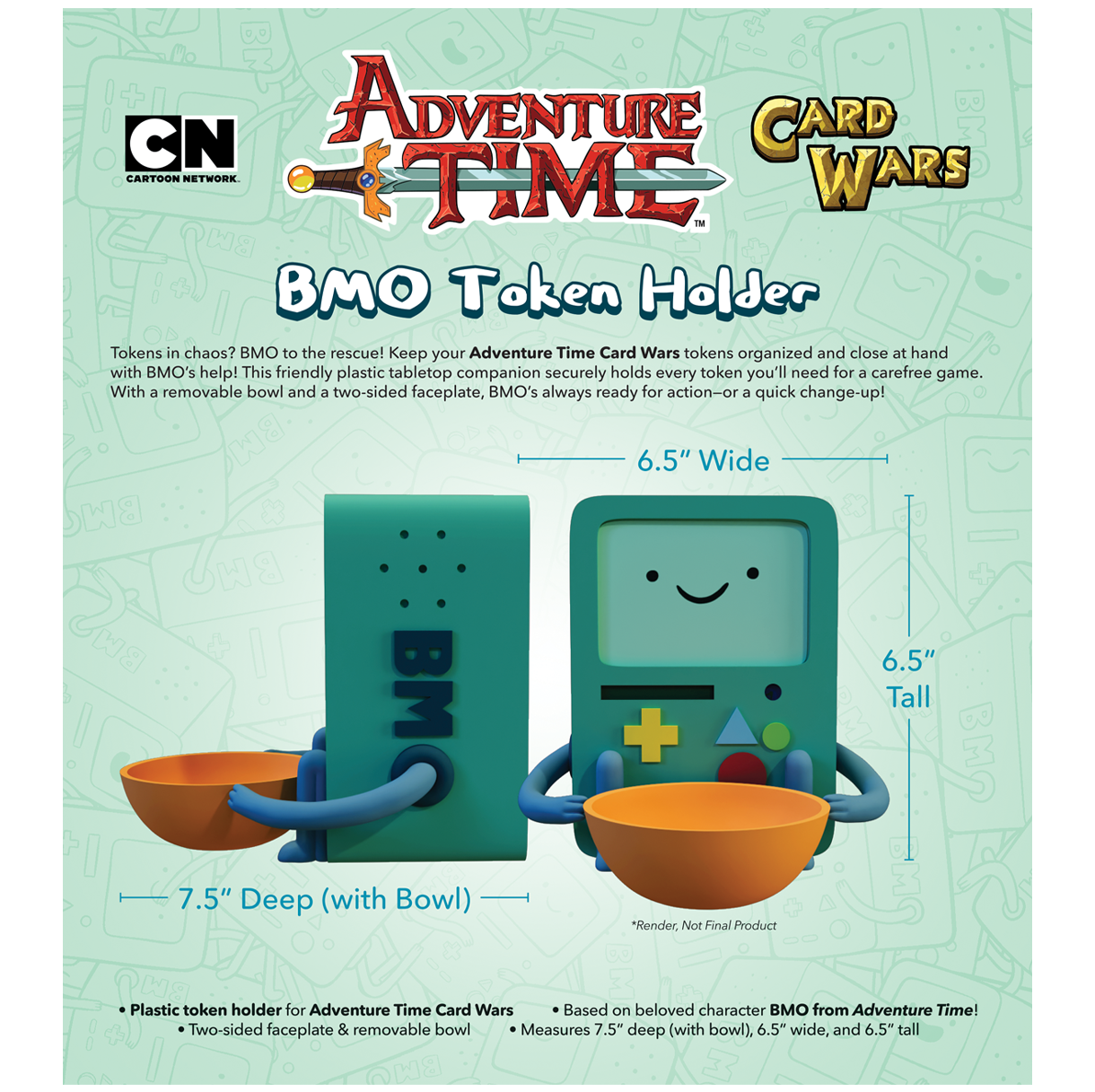 Keep your Adventure Time Card Wars tokens organized and close at hand with BMO's help! This friendly plastic tabletop companion securely holds every token you'll need for a carefree game. With a removable bowl and a two-sided faceplate, BMO's always ready for action-or a quick change-up!