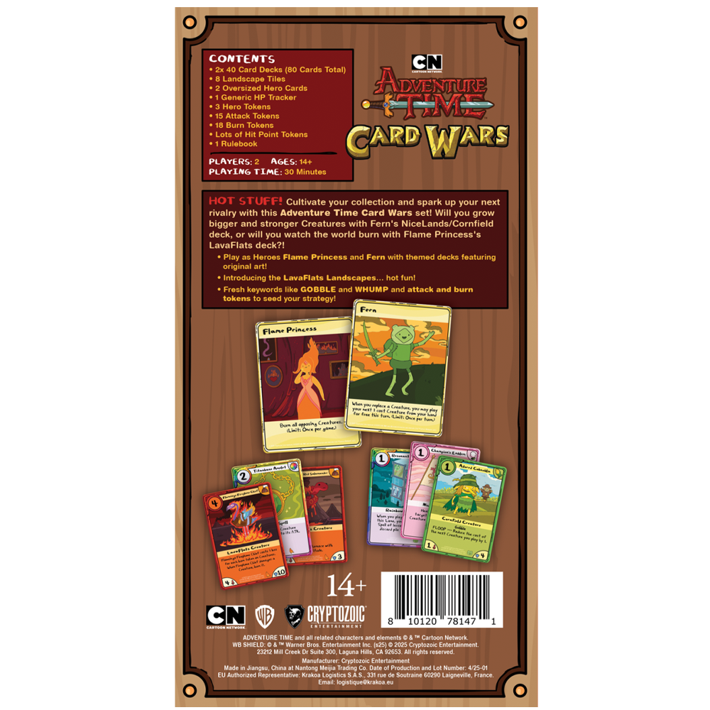 Cultivate your collection and spark up your next rivalry with this Adventure Time Card Wars set! Will you grow bigger and stronger Creatures with Fern's NiceLands/Cornfield deck, or will you watch the world burn with Flame Princess's LavaFlats deck?!