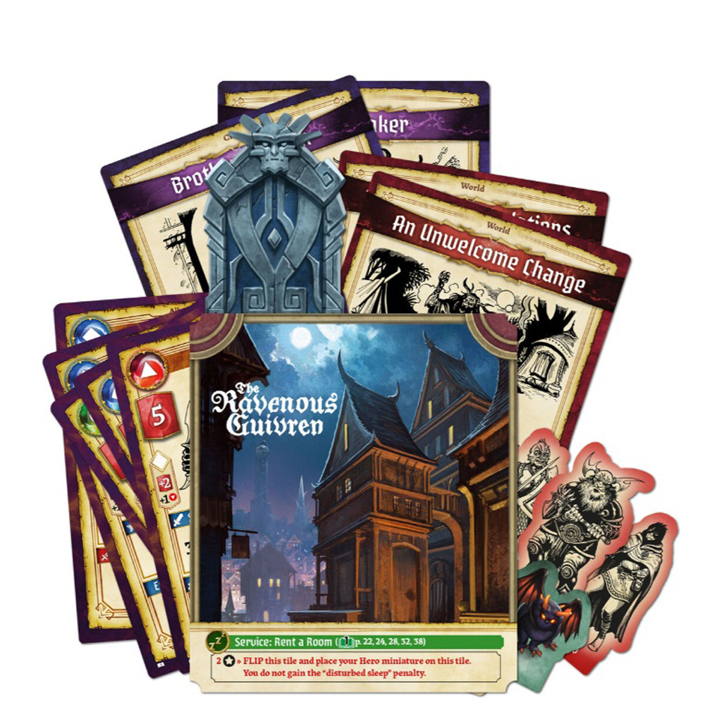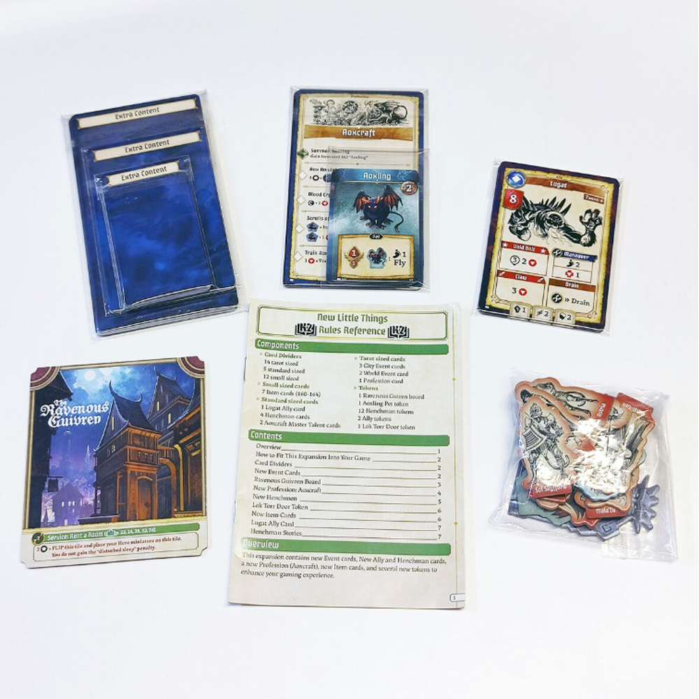 New Little Things expansion contains new Event cards, New Ally and Henchman cards, Henchmen standees to upgrade your henchmen with unique standees, a new Profession (Aoxcraft), new Item cards, card dividers, and several new tokens to enhance your gaming experience, including Lok Dorr door and a Ravenous Guivren board with a new a Night at the Guivren service.
