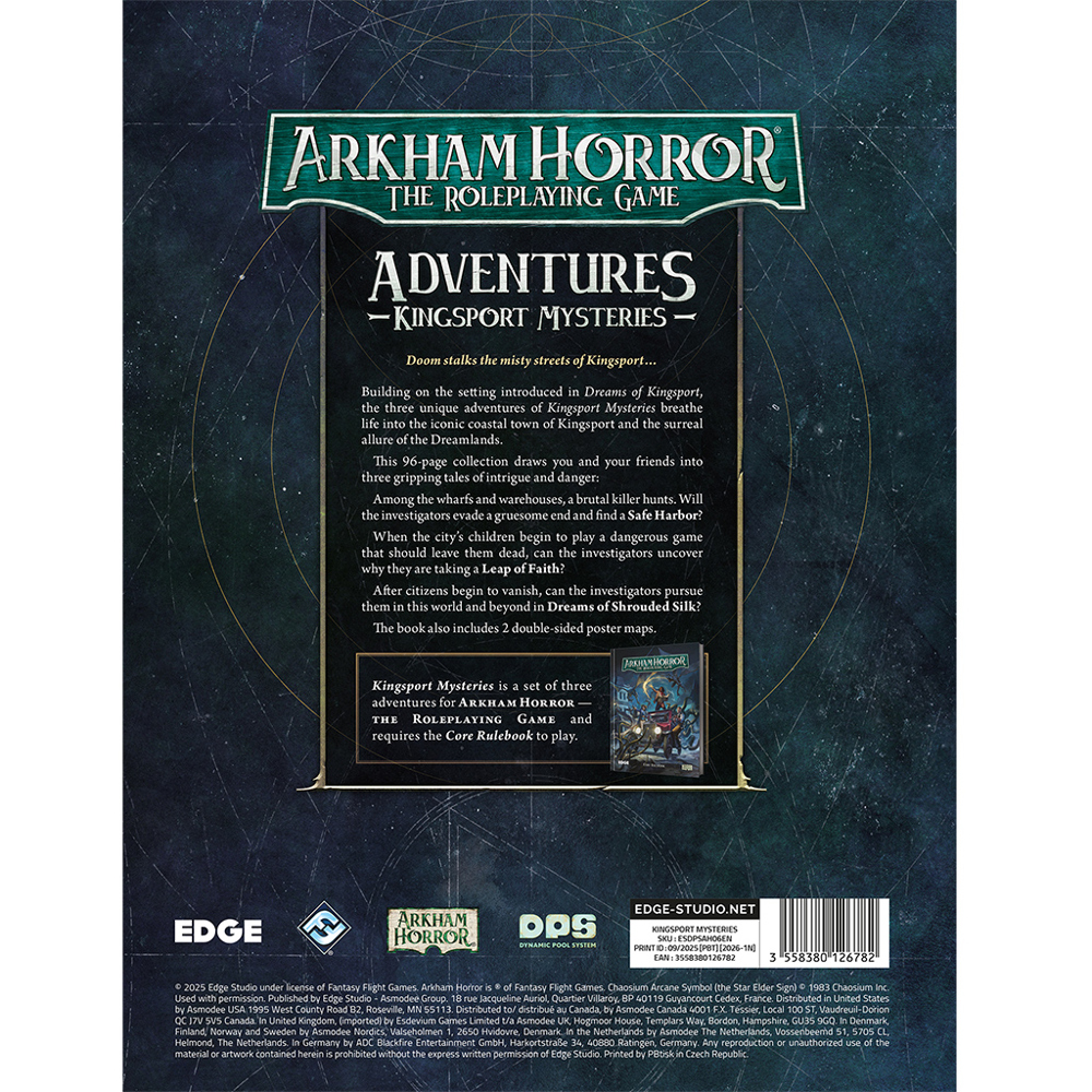 Building on the setting introduced in Dreams of Kingsport, the three unique adventures of Kingsport Mysteries breathe life into the iconic coastal town of Kingsport and the surreal allure of the Dreamlands.
