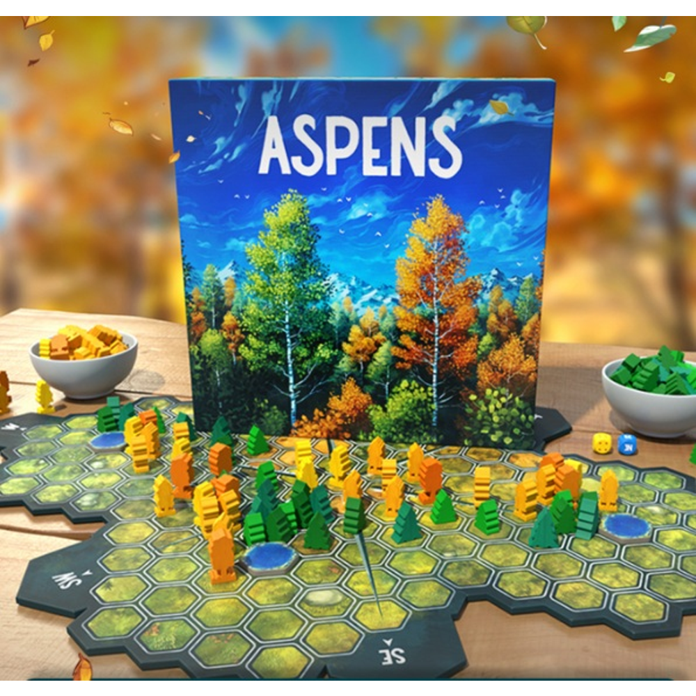 In Aspens, players compete to grow the largest forest on a shared board - having to balance how much they invest in building their "engine" to increase the odds of generating trees on future turns, with the pressure of needing to expand to claim territory and ultimately be crowned the winner.