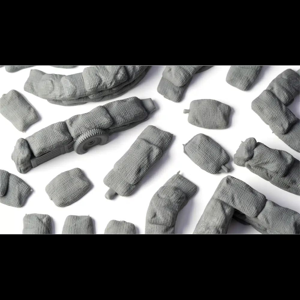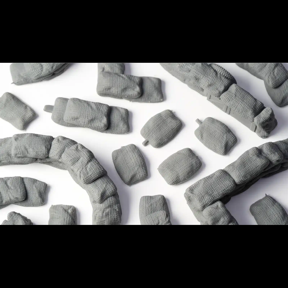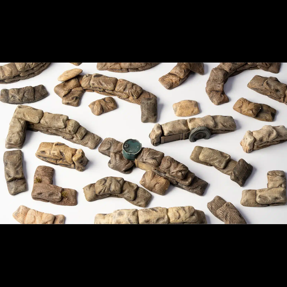 This box contains an assorted mix of thermoplastic Sandbag Barricades Basing Bits.