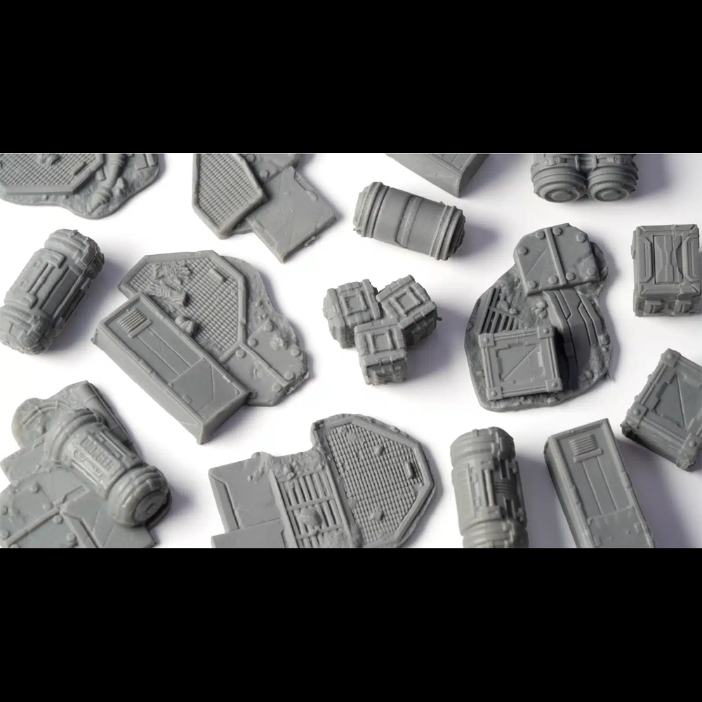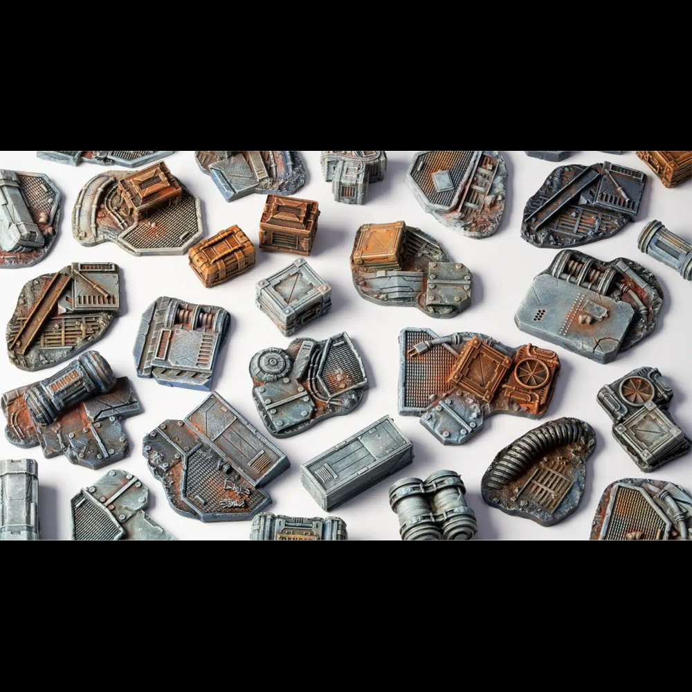 Spaceship Corridor Basing Bits are fragmented pieces of a lost spaceship. Perfect to simulate sci-fi containers, rusty metal floors, exposed wiring, and broken equipment scattered around. Each basing bit is carefully crafted to transport your miniatures to a sci-fi industrial world, challenging them to explore the partly buried corridors of an old derelict spacecraft.