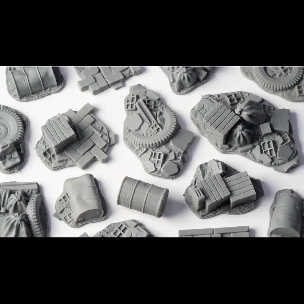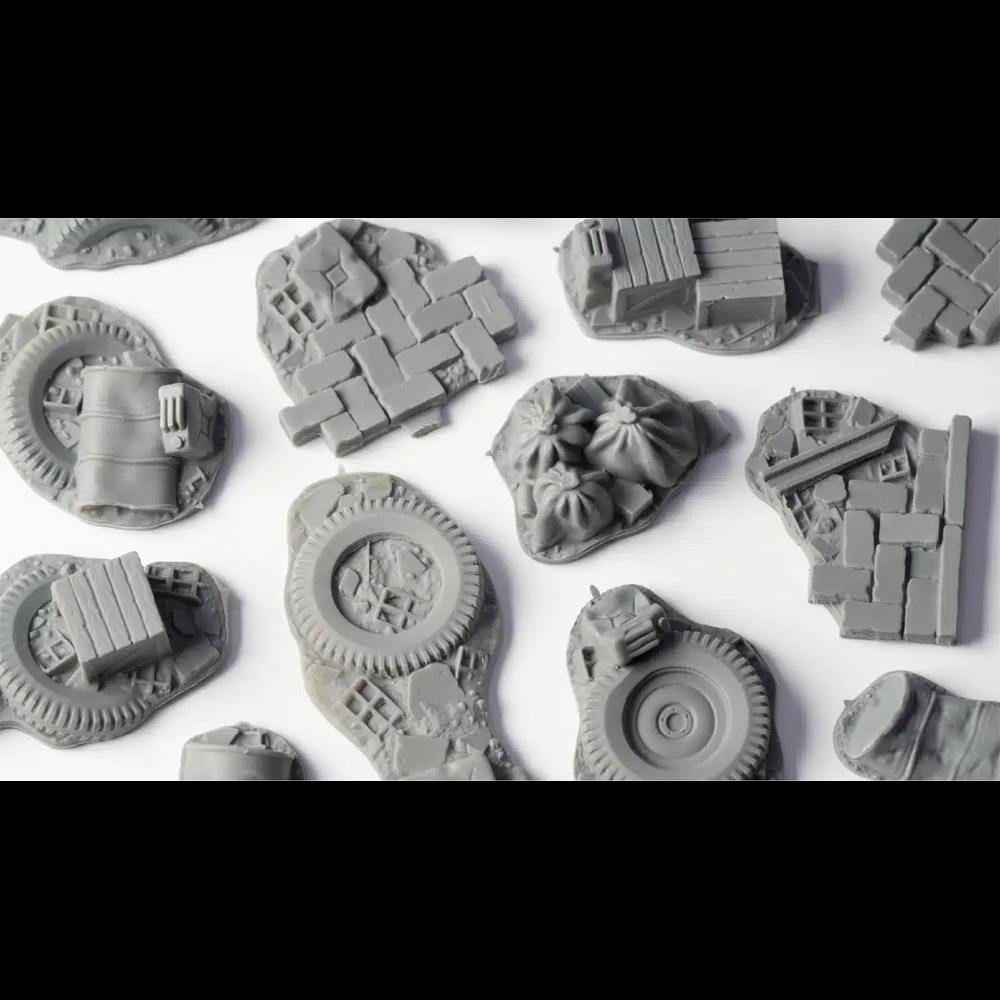 Urban Warfare Basing Bits are scaled replicas of urban war background props, for all times, from Great Wars to present and future conflicts. Lost wheels, fuel drums, broken asphalt and other debris will provide the right framework for your urban battles and post combat scenarios.