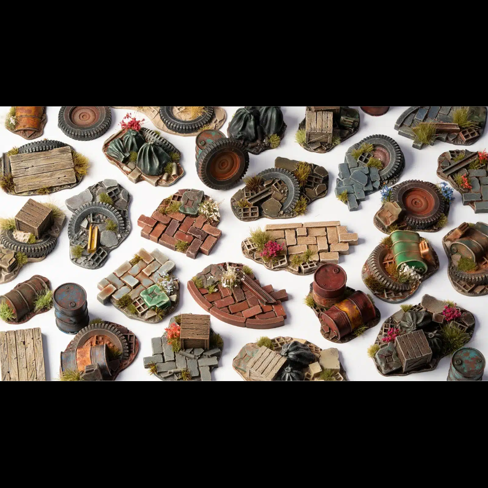Lost in the debris of war across past, present, and future, Urban Warfare captures a world where factions have clashed and crumbled. Barrels, jerrycans, shattered bricks, and rusted drums scatter the broken streets, painting a picture of devastation. Whether the ruins speak of past battles or the fallout of a post-apocalyptic future, this terrain tells a story of destruction and of hope. Between the cracks, signs of life begin to bloom, a quiet reminder that even in the darkest places, renewal will come.
