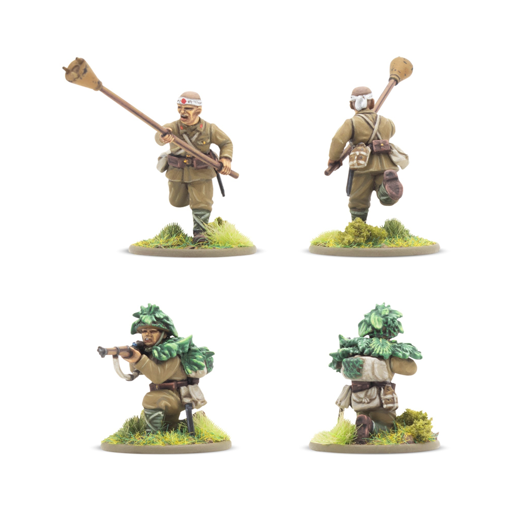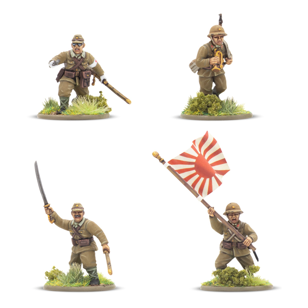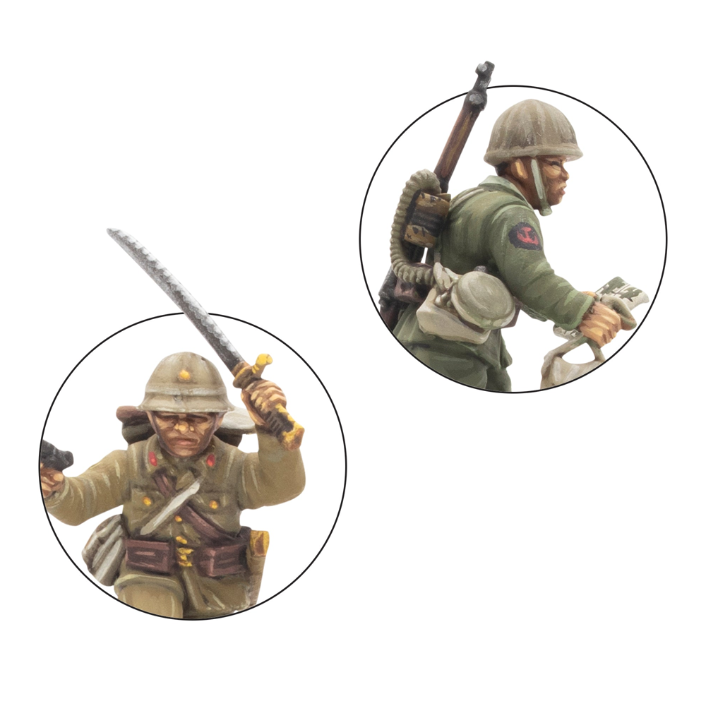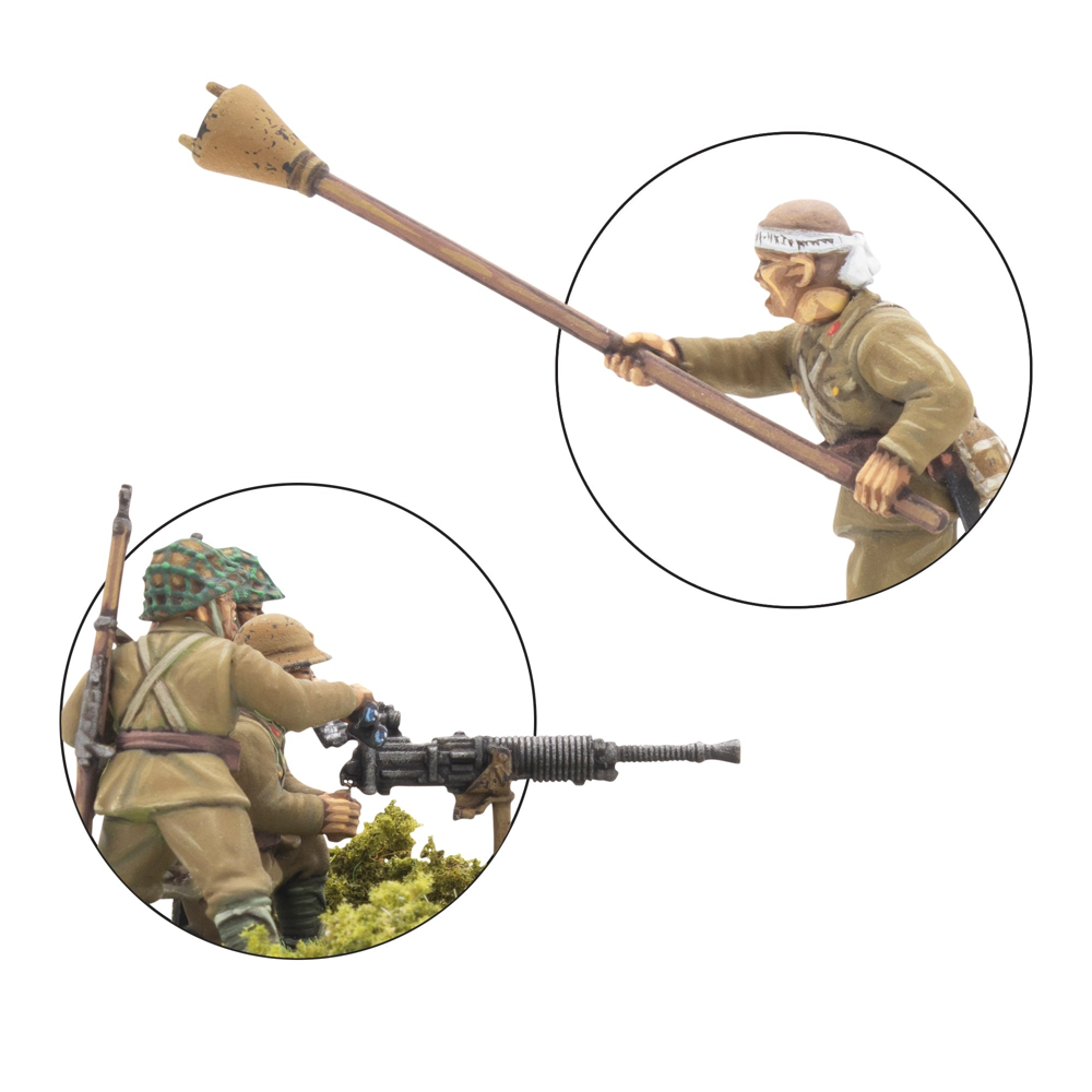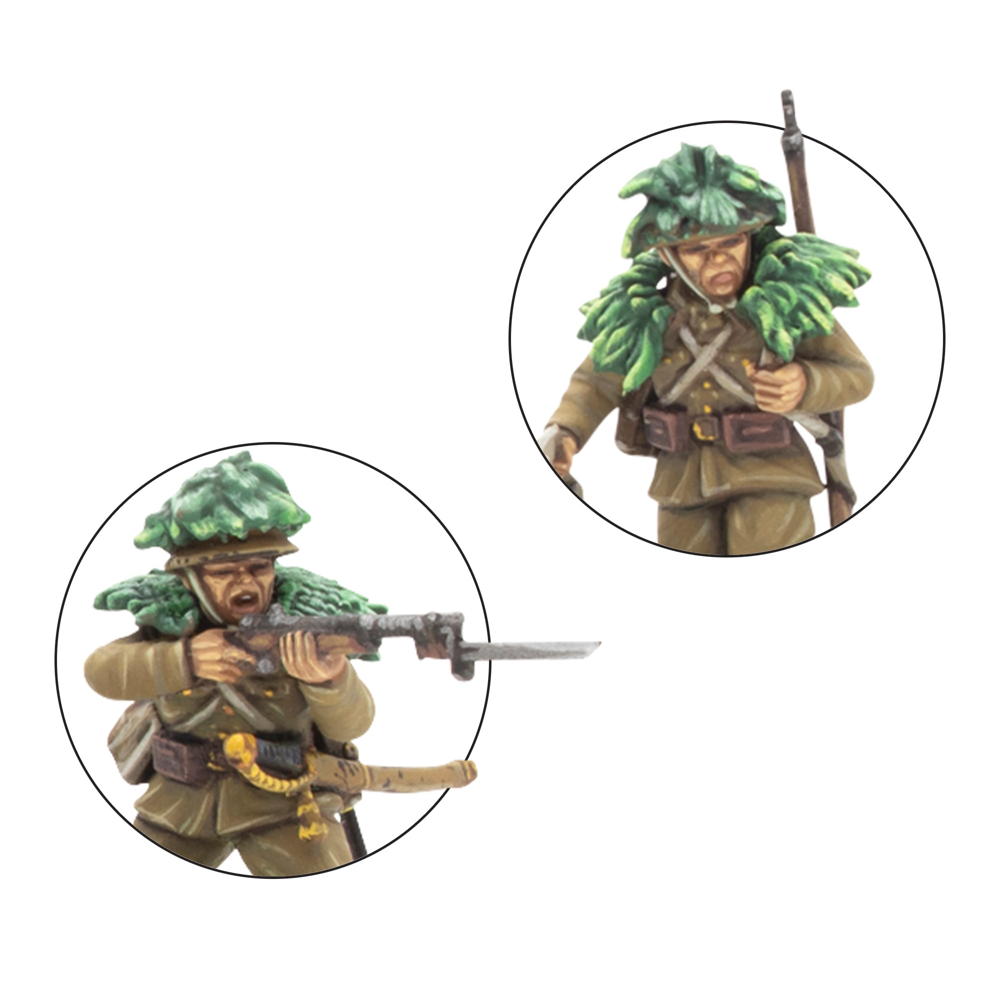 This box contains 30 infantry models allowing you to build a huge variety of Japanese infantry units. On each sprue, you'll find a wide range of weaponry, including Type 99 Arisaka Rifles, a Type 99 LMGs, a Type 89 Grenade Dischargers (also known as "knee mortars"), lunge mines, swords, and more besides. There's also a Type 92 Machine Gun enabling you to represent a Medium Machine Gun Team (we've included a trio of 60mm bases to help with such an endeavour!), and plenty of extra pieces to customise your troops further. Most crucially a variety of heads and gear is included that allow you to represent not only troops of the Imperial Japanese Army, but also those of the Special Naval Landing Forces, or Veteran Jungle Fighters and take advantage of the Yamato Damashii special rule!