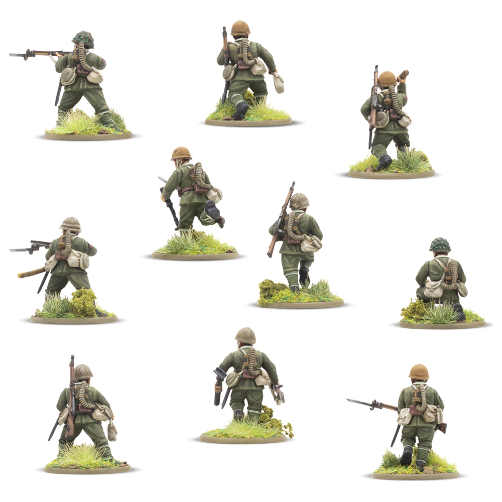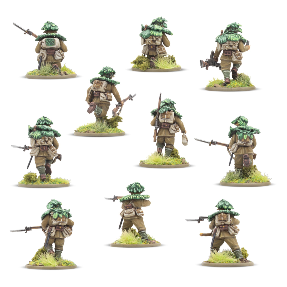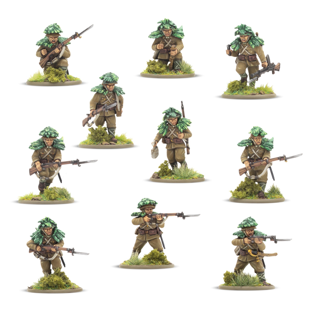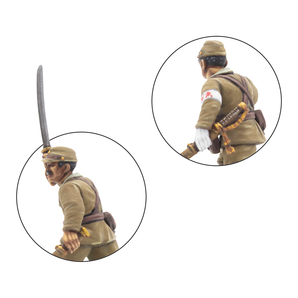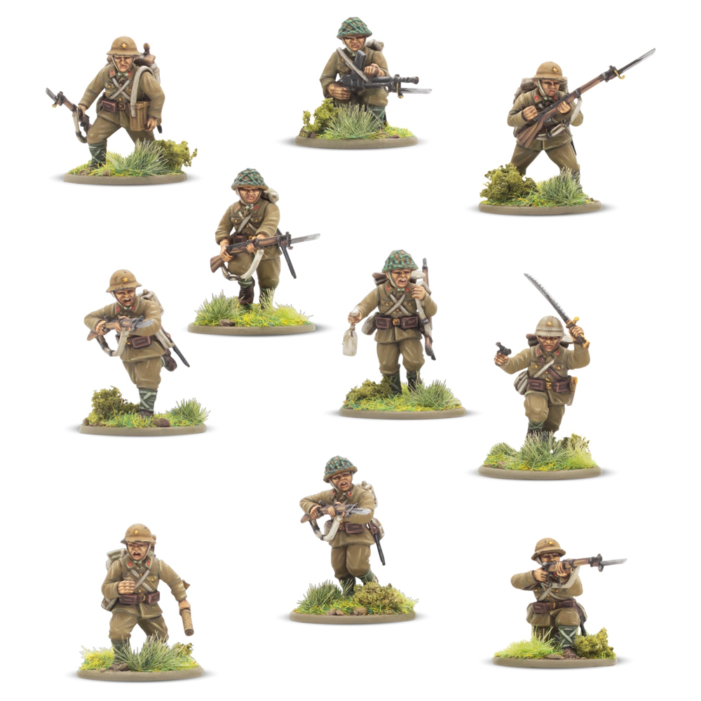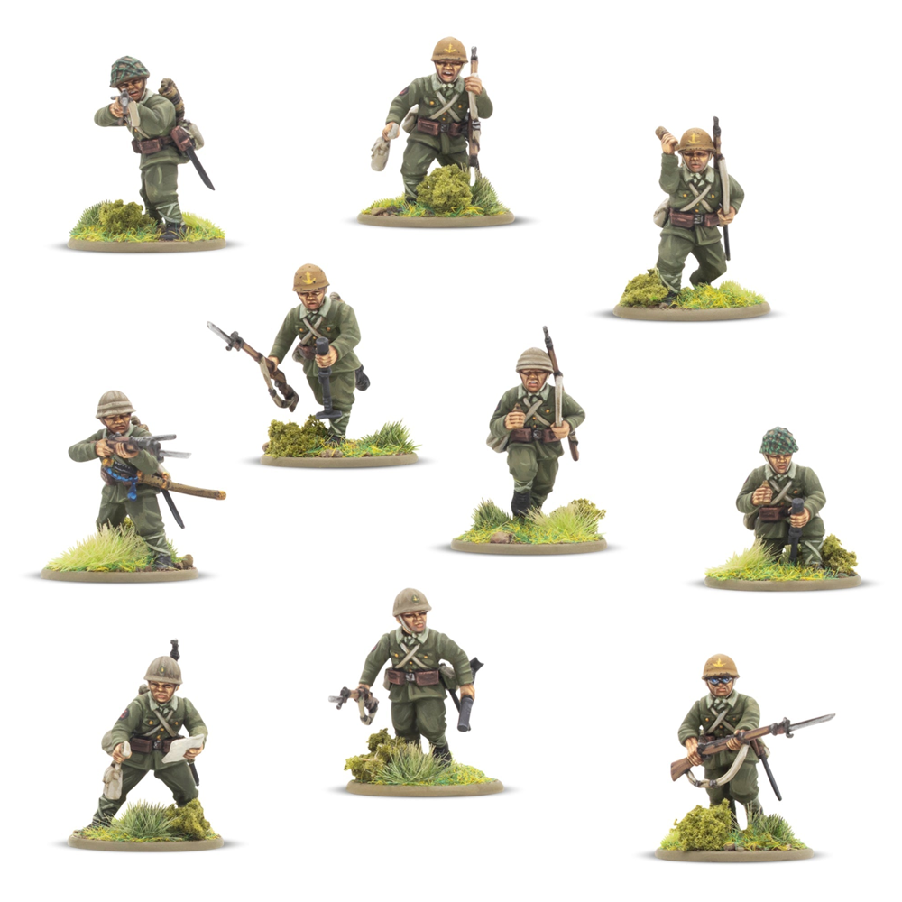 This box contains 30 infantry models allowing you to build a huge variety of Japanese infantry units. On each sprue, you'll find a wide range of weaponry, including Type 99 Arisaka Rifles, a Type 99 LMGs, a Type 89 Grenade Dischargers (also known as "knee mortars"), lunge mines, swords, and more besides. There's also a Type 92 Machine Gun enabling you to represent a Medium Machine Gun Team (we've included a trio of 60mm bases to help with such an endeavour!), and plenty of extra pieces to customise your troops further. Most crucially a variety of heads and gear is included that allow you to represent not only troops of the Imperial Japanese Army, but also those of the Special Naval Landing Forces, or Veteran Jungle Fighters and take advantage of the Yamato Damashii special rule!
