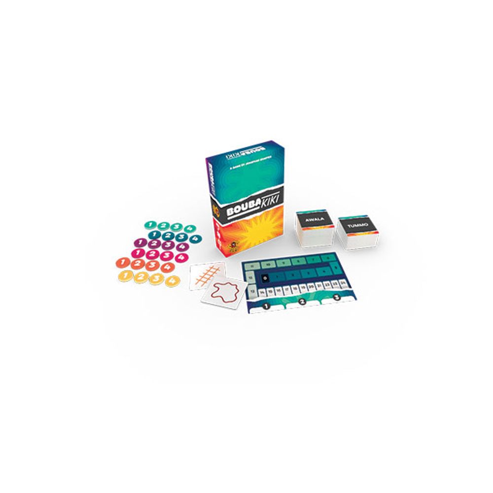 The cards in Bouba/Kiki display a nonsense word on one side, and a simple illustration on the other. In the basic game, you are faced with a set of three of these words and one shape, and must decide which word goes best with the shape. Points are earned by choosing the same target as your teammates.