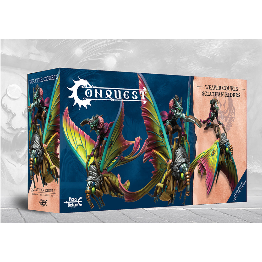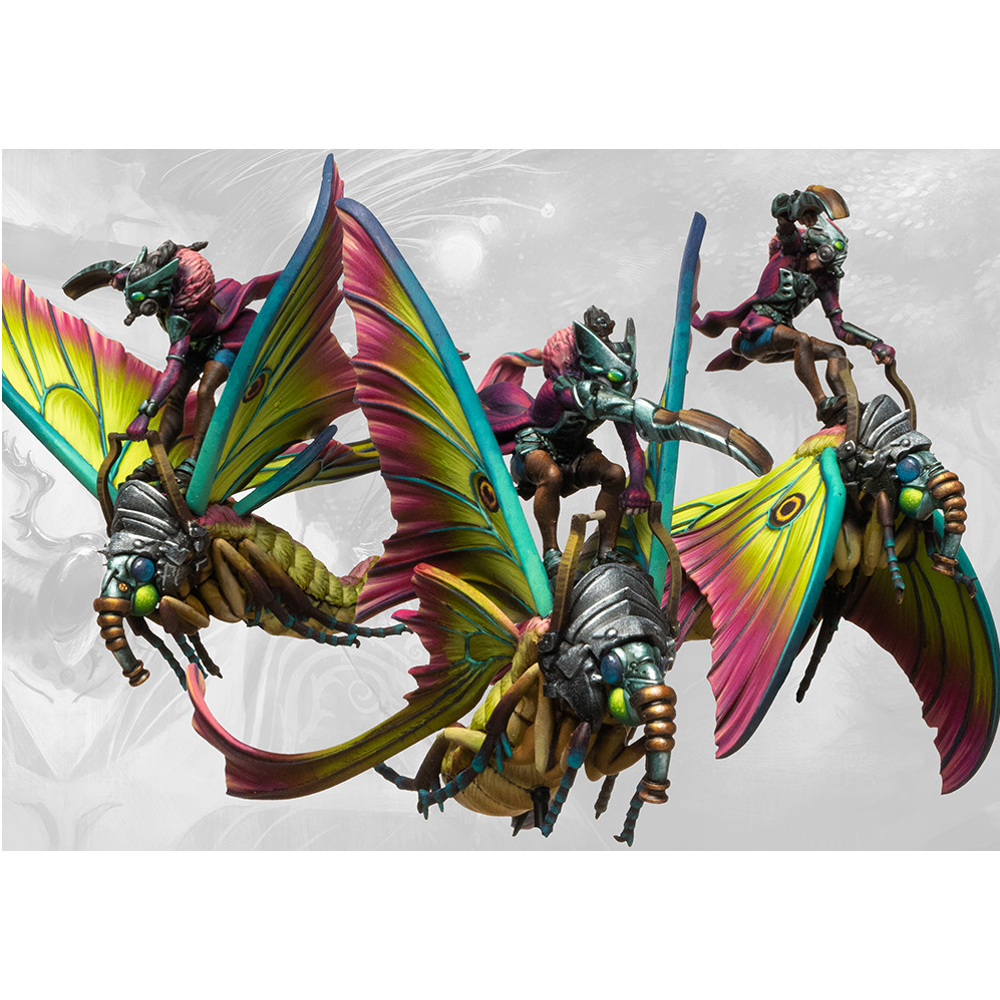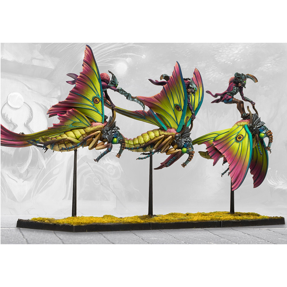 Lunopeth Moths were tamed and bound millennia ago by the Weaver Courts. Long lines of these night flyers have been life-bound to the weavers for so long, they are now an inseparable part of their society. The tangled terrain and verticality of the Weaver Domains lends itself to flying mounts. Their delicate bodies do not lend themselves well to the rigors of combat, but the Weavers have compensated for this, arming their riders with ranged weapons. The Sciathan (pronounced Shkee-haan) warriors are able to hurl noxious pods of awakened seeds on their foe, equipped to protect themselves from the inevitable fumble as they cast their deadly cargo with the aid of curved gloves deep into the ranks of the enemy.