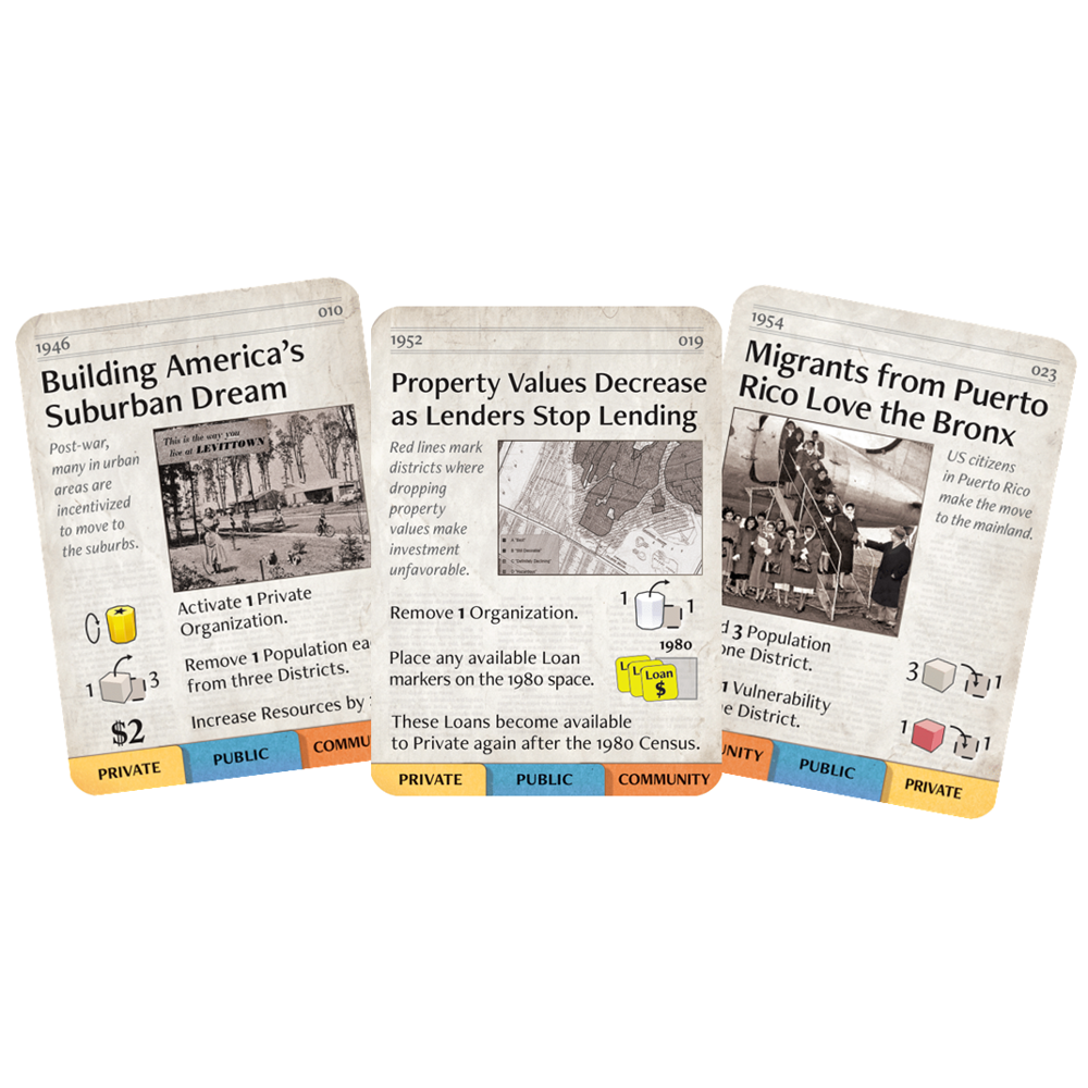 Through a card driven sequence of play, they will work to solve the economic challenges facing the area by building infrastructure and organizations, forming coalitions, mitigating the multitude of issues facing the vulnerable population, and managing resources to stay out of debt. Cross Bronx Expressway offers an engaging way to learn about the recent history of American cities, as exemplified by Jane Jacobs' pivotal work The Death and Life of Great American Cities, simulated through the case study of the South Bronx. Players will experience the conflicting incentives and complex factors shaping urban life, and together determine the fate of the Bronx.