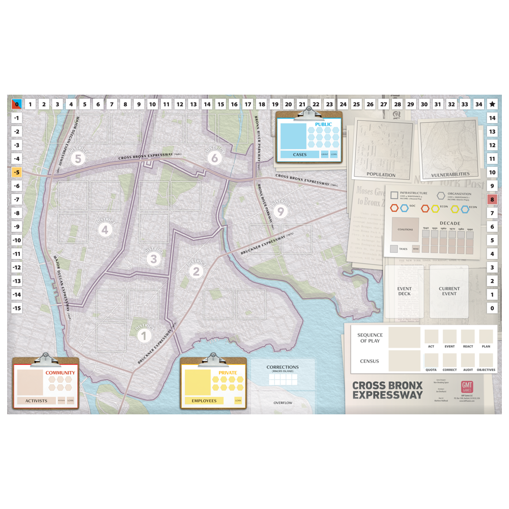 Cross Bronx Expressway is the third game in the Irregular Conflicts Series. It simulates the socio-economic processes of urban development, and the human costs that result, as a competitive city-builder with collective loss conditions. Players control one of three asymmetric factions working in the South Bronx between 1940 and 2000, pursuing their own goals while cooperating to keep the borough viable.