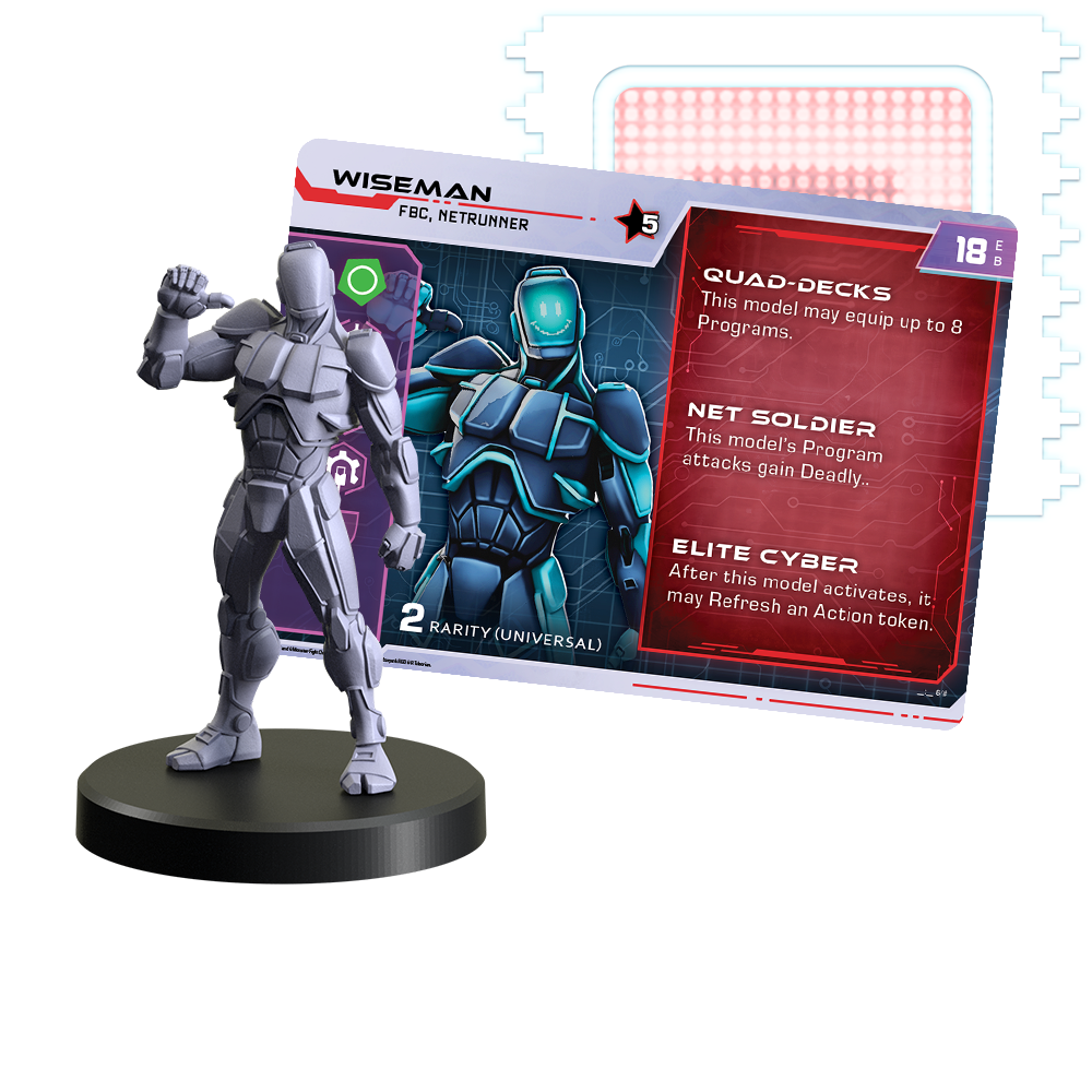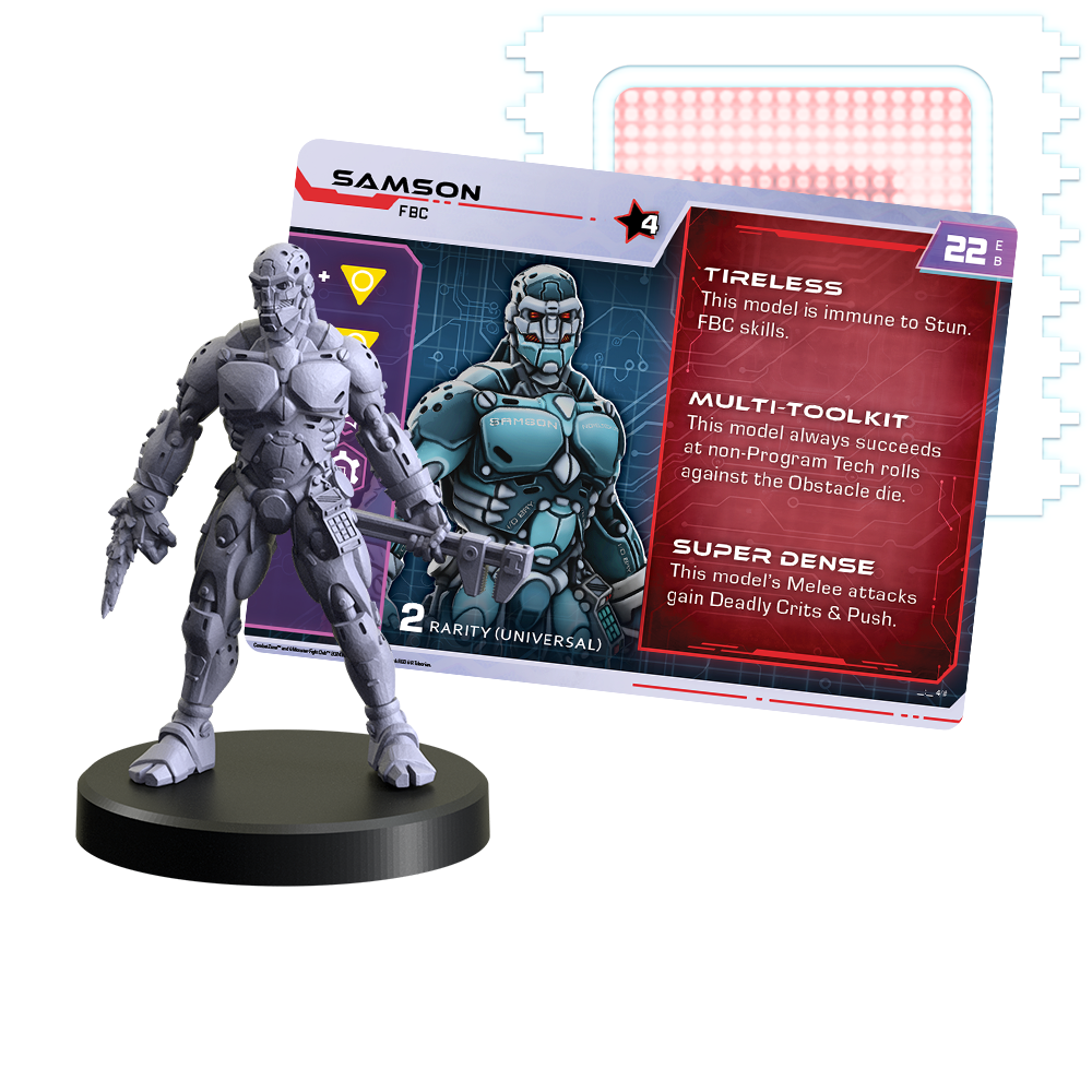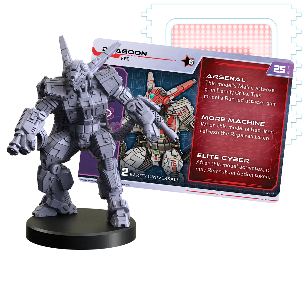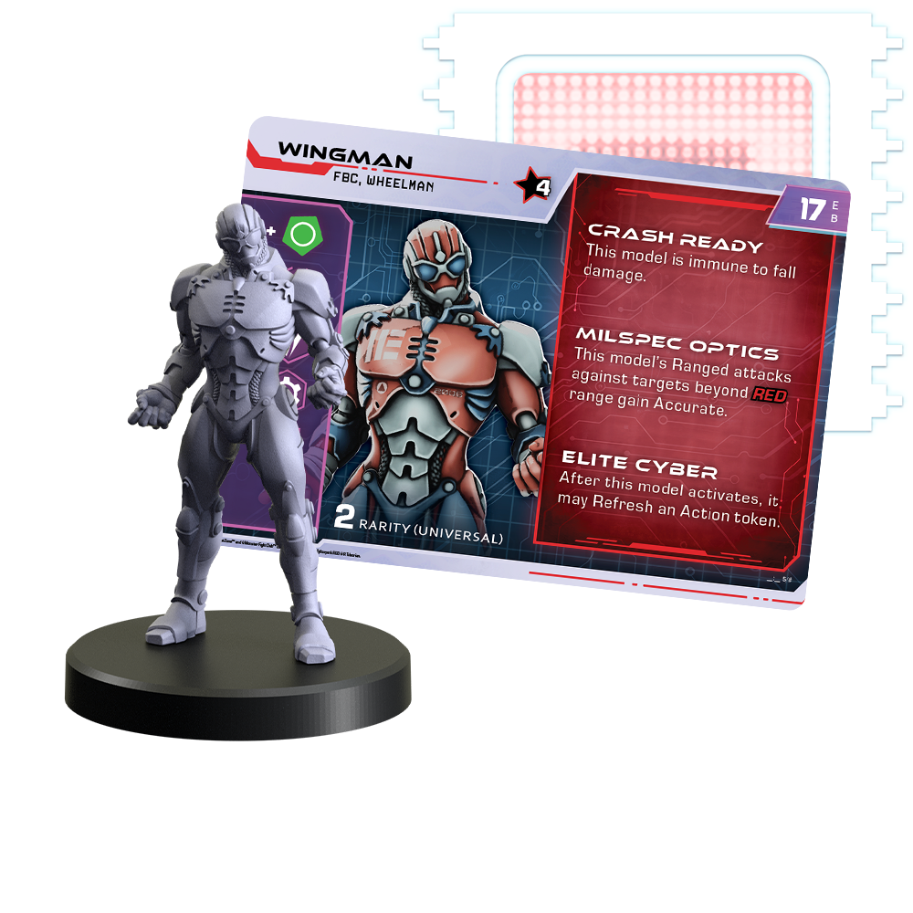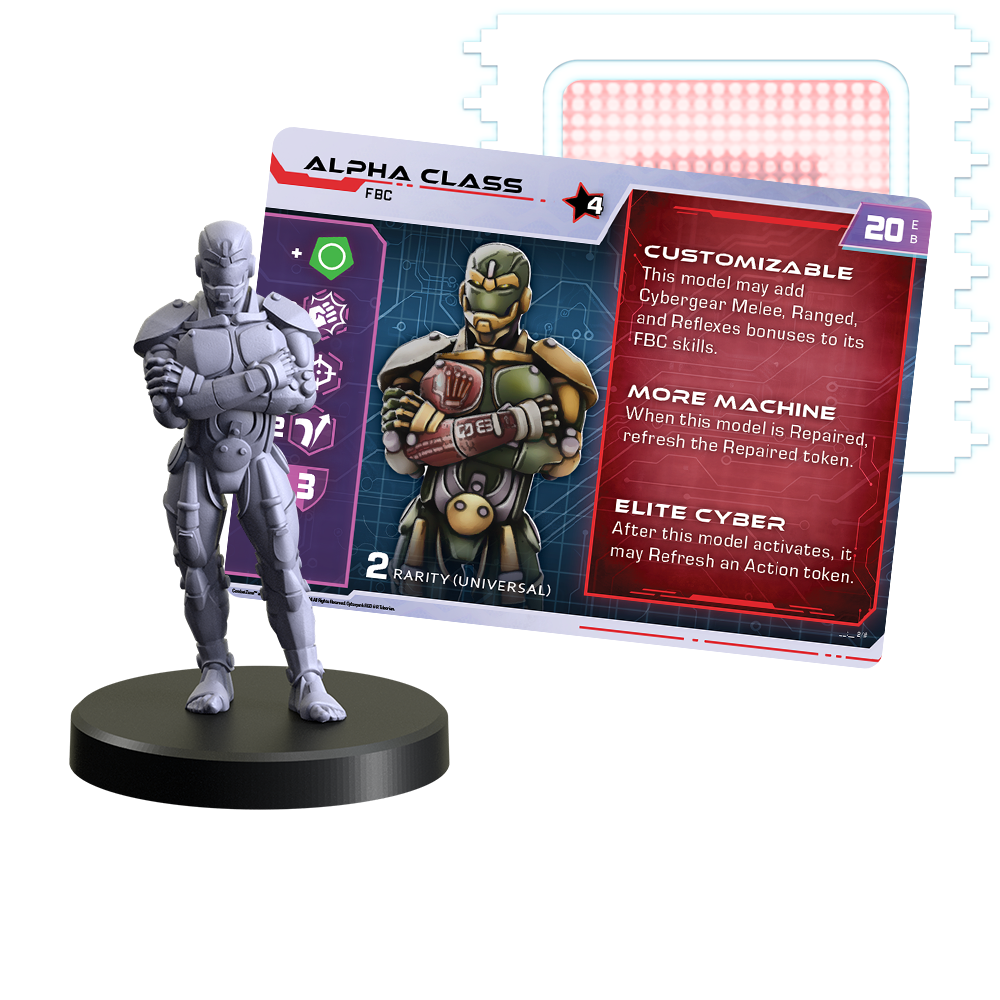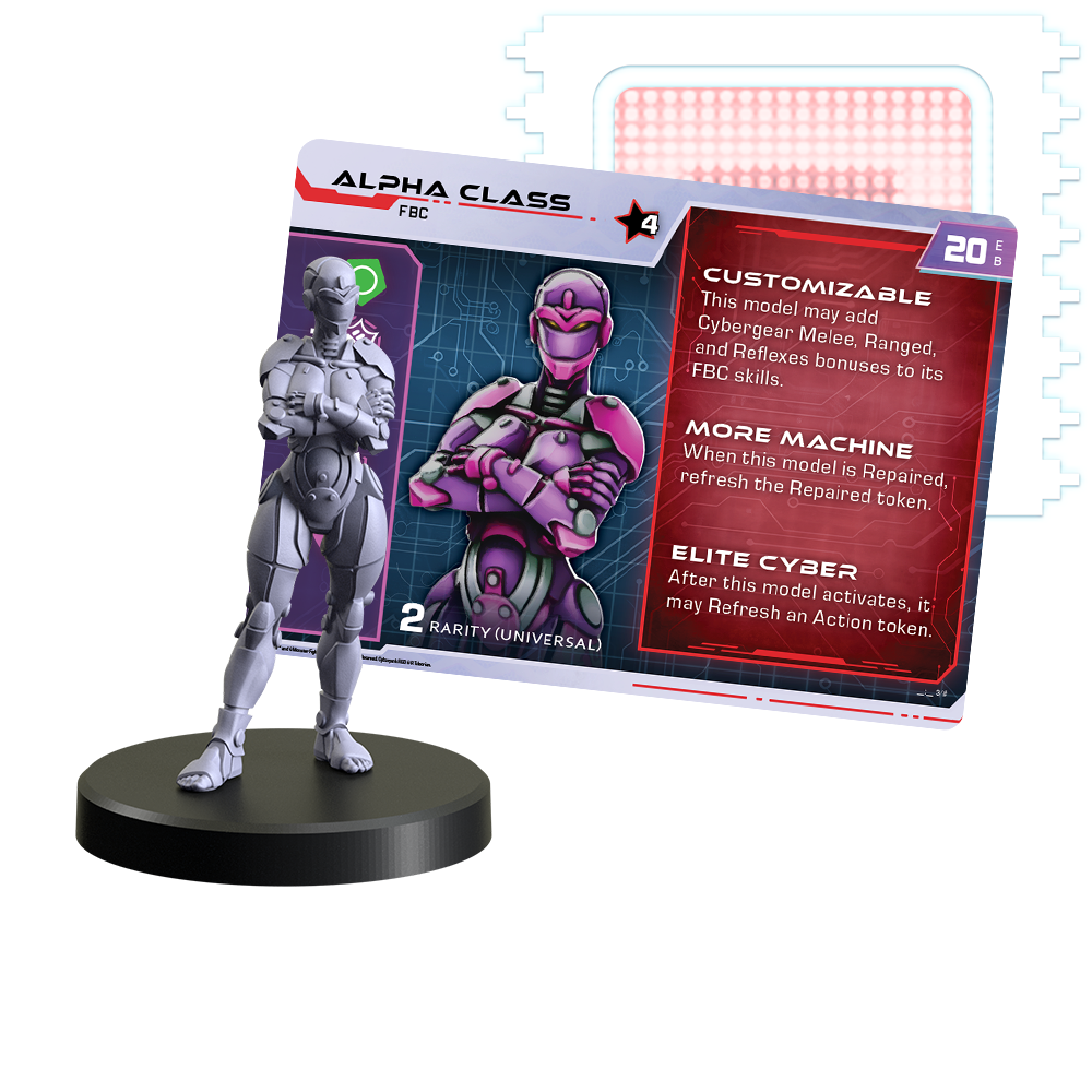 Each model in the set is paired with a Full Body Conversion (FBC) card, detailing unique abilities and stats that reflect its advanced cybernetic design. These tarot-sized cards function much like gear cards, seamlessly replacing your Character's model without altering their stat card. Instead, the FBC grants powerful upgrades and new combinations of abilities.