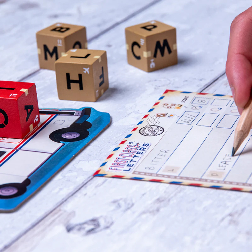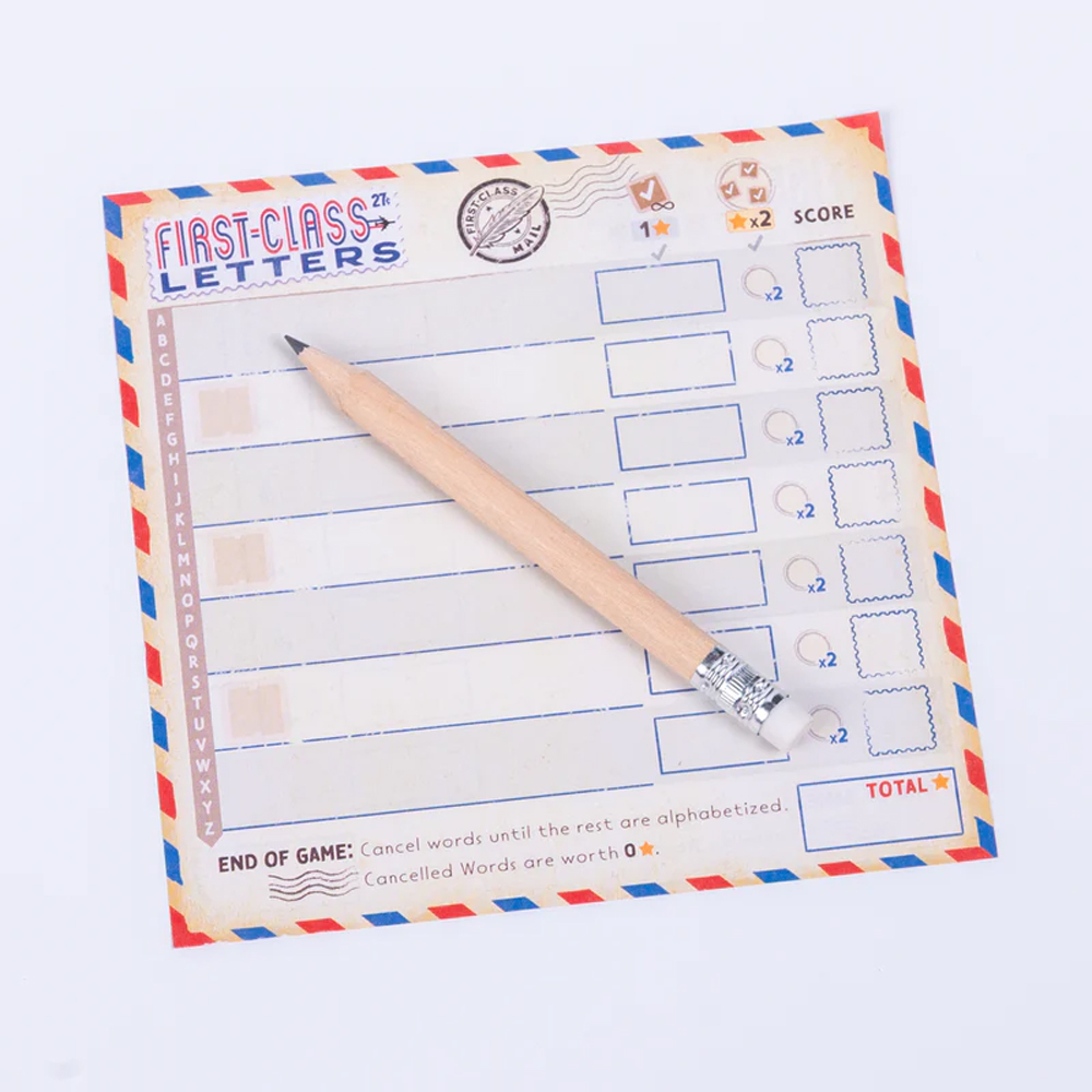 First-Class Letters is a roll-and-write word game played over 7 rounds. Each round players write a word on their sheet using letters rolled on dice, as much as they can. The words on their sheet must be kept in alphabetical order, or be cancelled out!