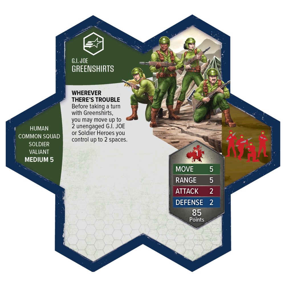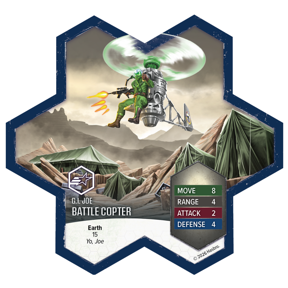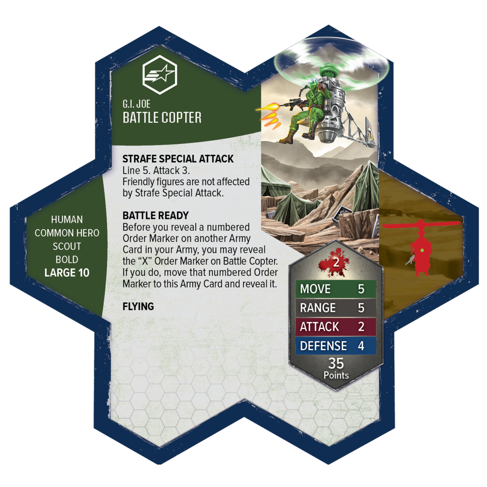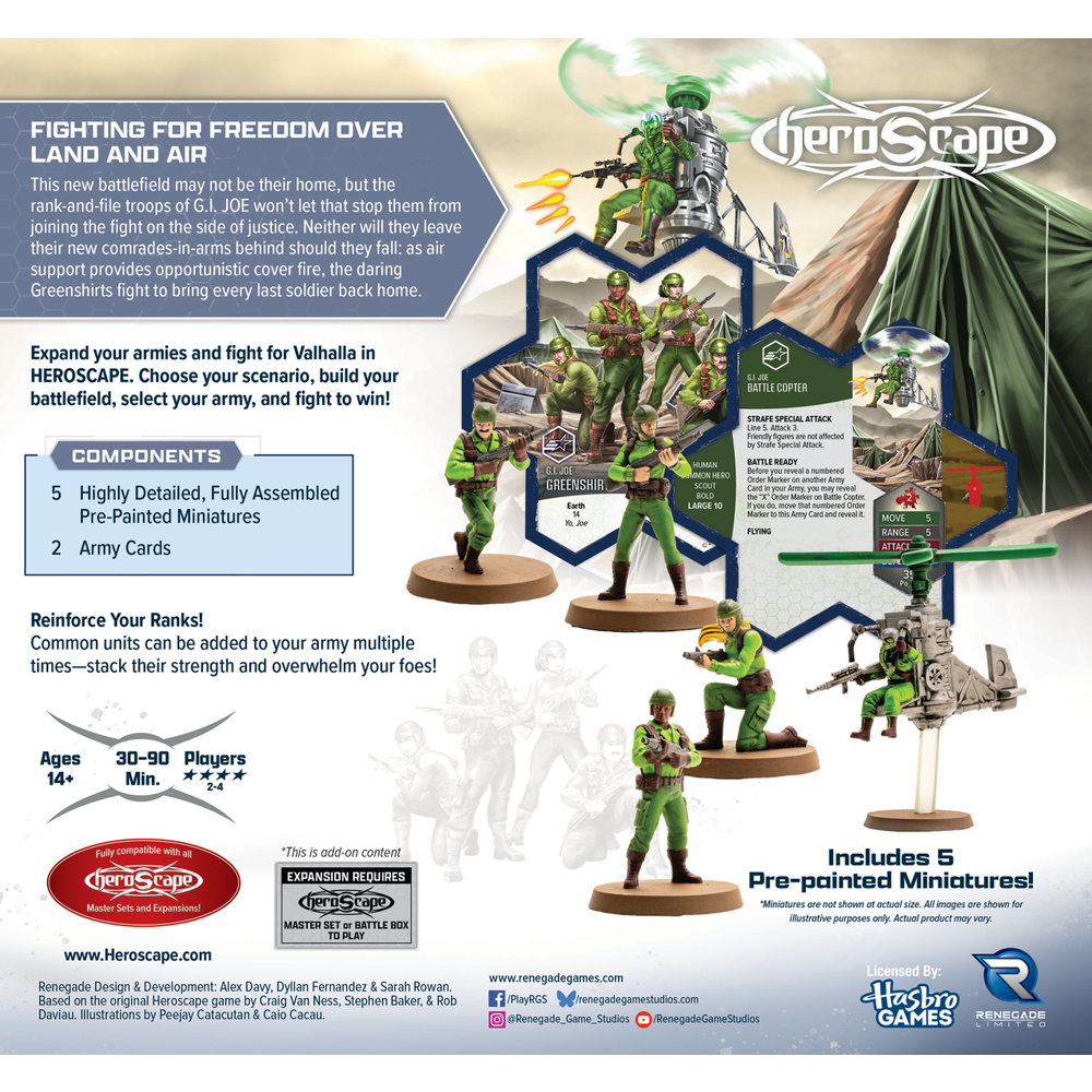 This expansion includes one Common Hero, one 4-figure Common Squad, and two Army Cards. The Greenshirts coordinate with nearby G.I. JOE and Soldier Heroes, moving them into position before unleashing their own attacks. Above the battlefield, the Battle Copter swoops in with a devastating Strafe Special Attack that spares friendly forces, ready to take command at a moment's notice. Together, these common troops and airborne support units deliver new tactical flexibility to your Heroscape armies.