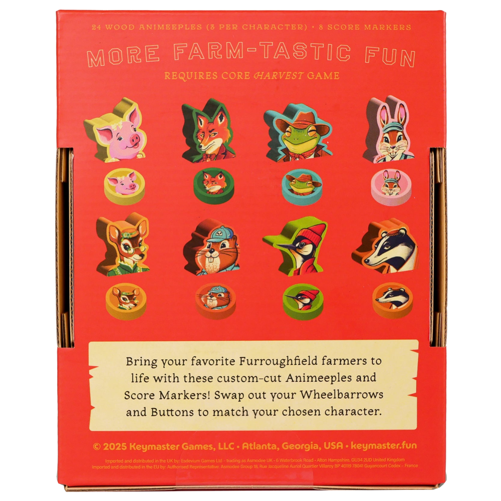 Bring your favorite Furroughfield farmer to life on the board with these custom-cut wooden Animeeples! Swap out your player Wheelbarrows for these colorfully printed meeples to match your chosen character. The set includes 24 total Animeeples across the 8 Characters in Harvest and an upgraded score token for each character (8 total).