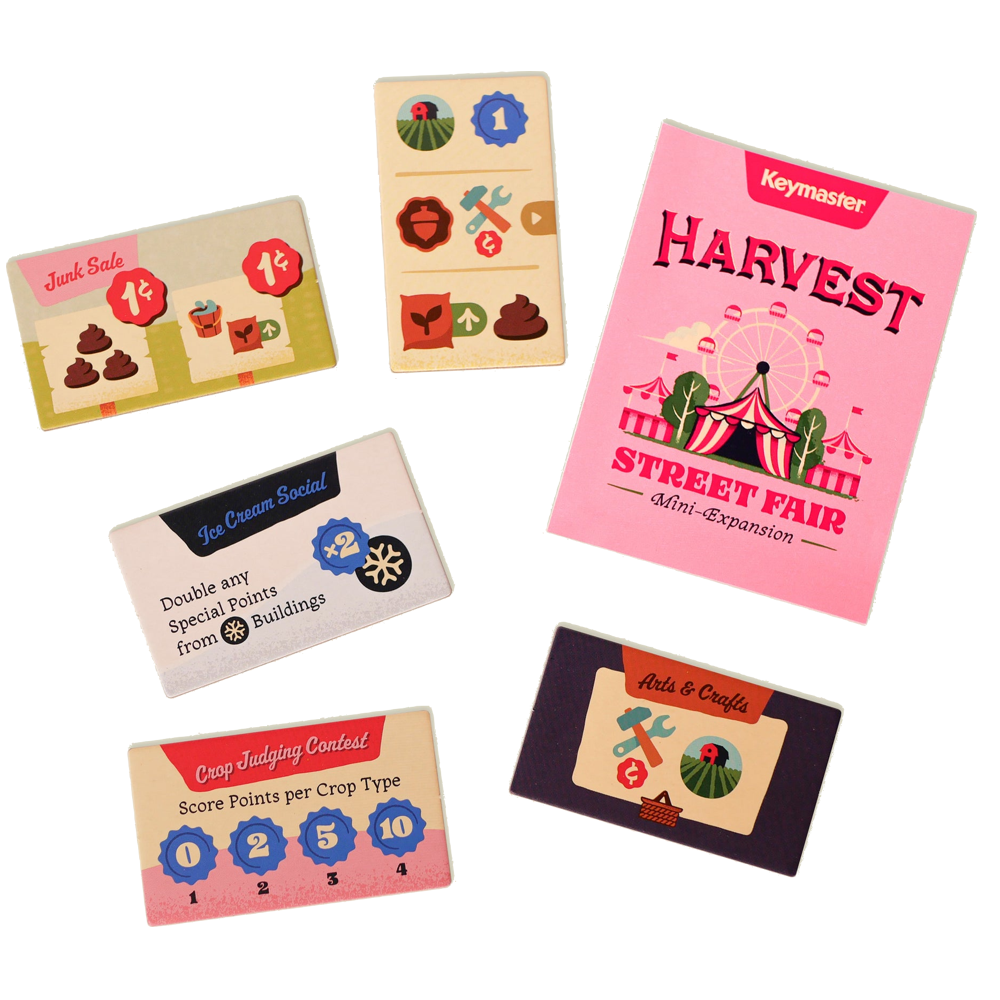 The fair has come to town! Come on down and enjoy new activities, scoring opportunities, and fun. In each game of Harvest, a Fair Tile will come into play to add bonuses or change up a specific area of the board. Each of the 5 tiles is printed front-and-back, allowing for ten new ways to shake up all the happenings in Furroughfield.