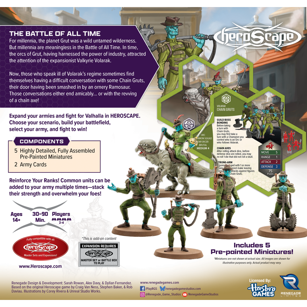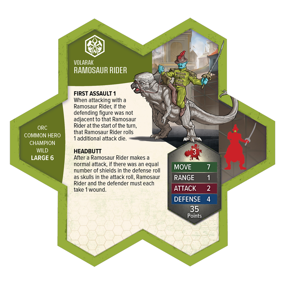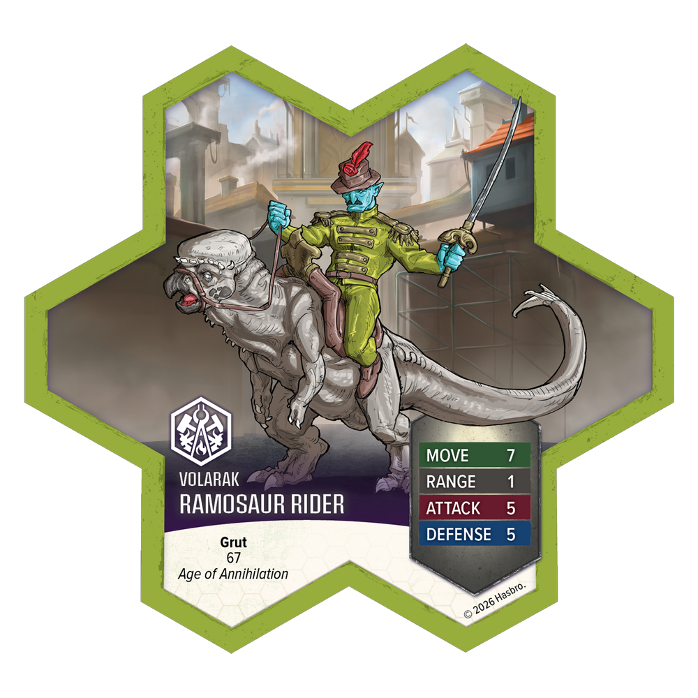 This expansion includes one 4-figure Common Squad and a Common Hero. The highly detailed, pre-assembled miniatures and 2 Army Cards are fully compatible with all Heroscape Battle Boxes, Master Sets, and Expansions. Get ready to charge onto the battlefield with the Ramosaur Rider, smashing enemy lines with devastating speed, and the Chain Gruts fighting in perfect coordination with their champions.