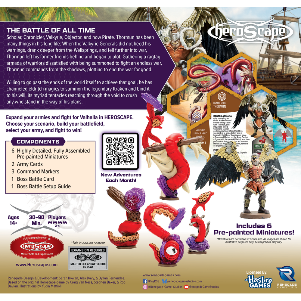 This expansion includes 1 Unique Hero, a 5-figure Unique Squad, and instructions for a 2 or 3-player Boss Battle Scenario. The highly detailed, pre-assembled miniatures and 3 Army Cards are fully compatible with all Heroscape Battle Boxes, Master Sets, and Expansions. Command the cunning Valkyrie-turned-pirate Thormun and his monstrous ally, the legendary Kraken! Thormun rallies disillusioned warriors with strategic Command Markers, while the Kraken strikes from beyond the battlefield, its many tentacles dragging enemies to their doom.