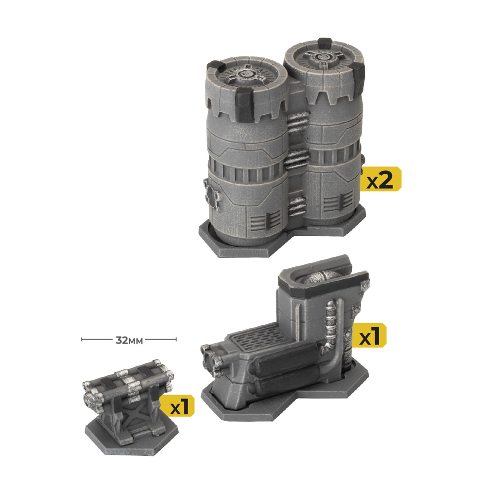 The Hextech Industrial Fluidworks line is a modular construction set designed to meet the chemical, fuel, or water processing and logistics needs of any size installation, from military bases to sprawling mega-cities.