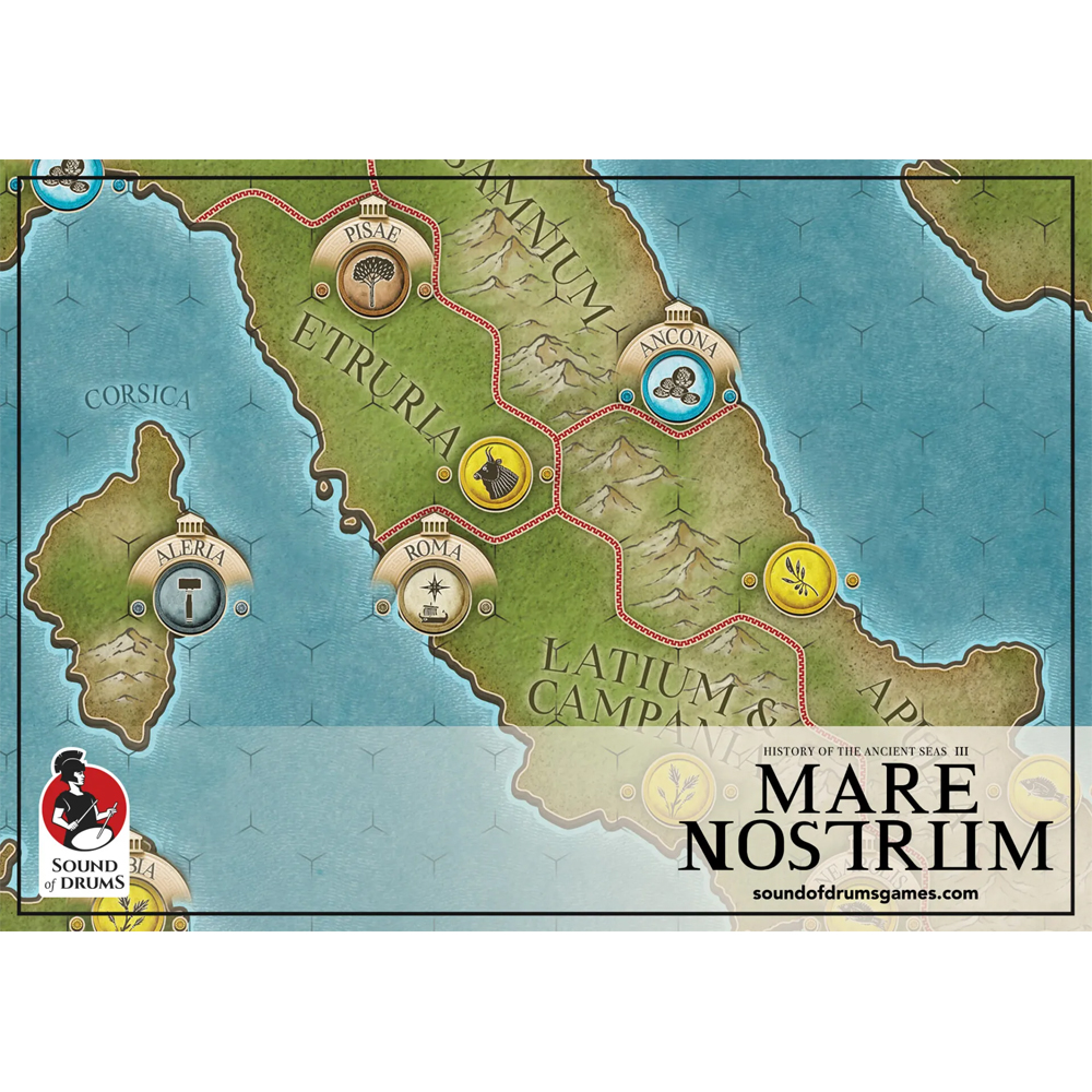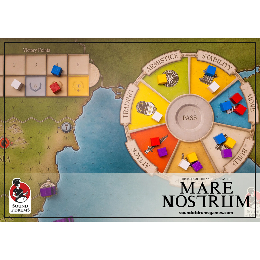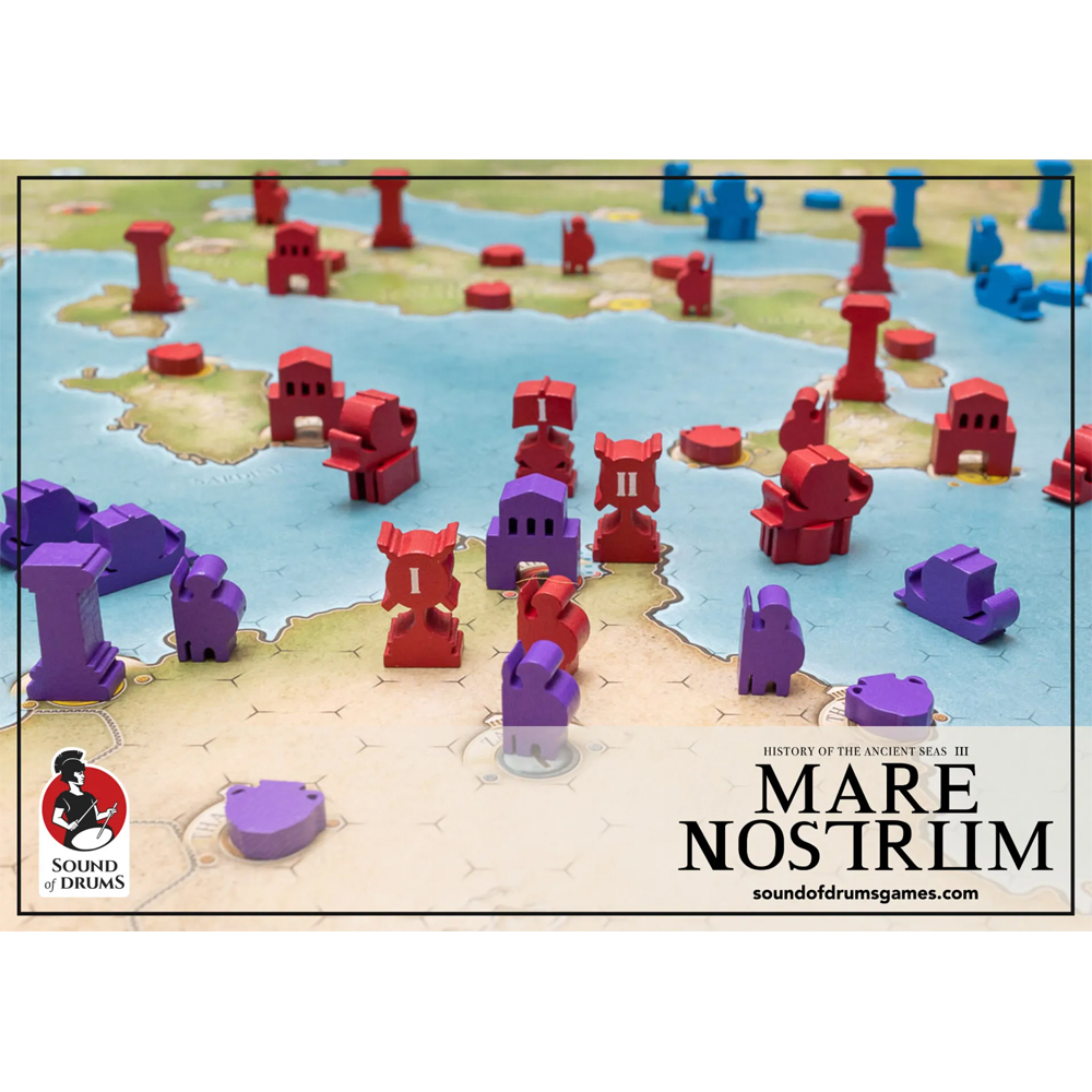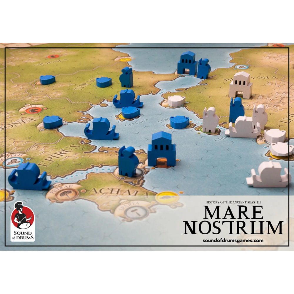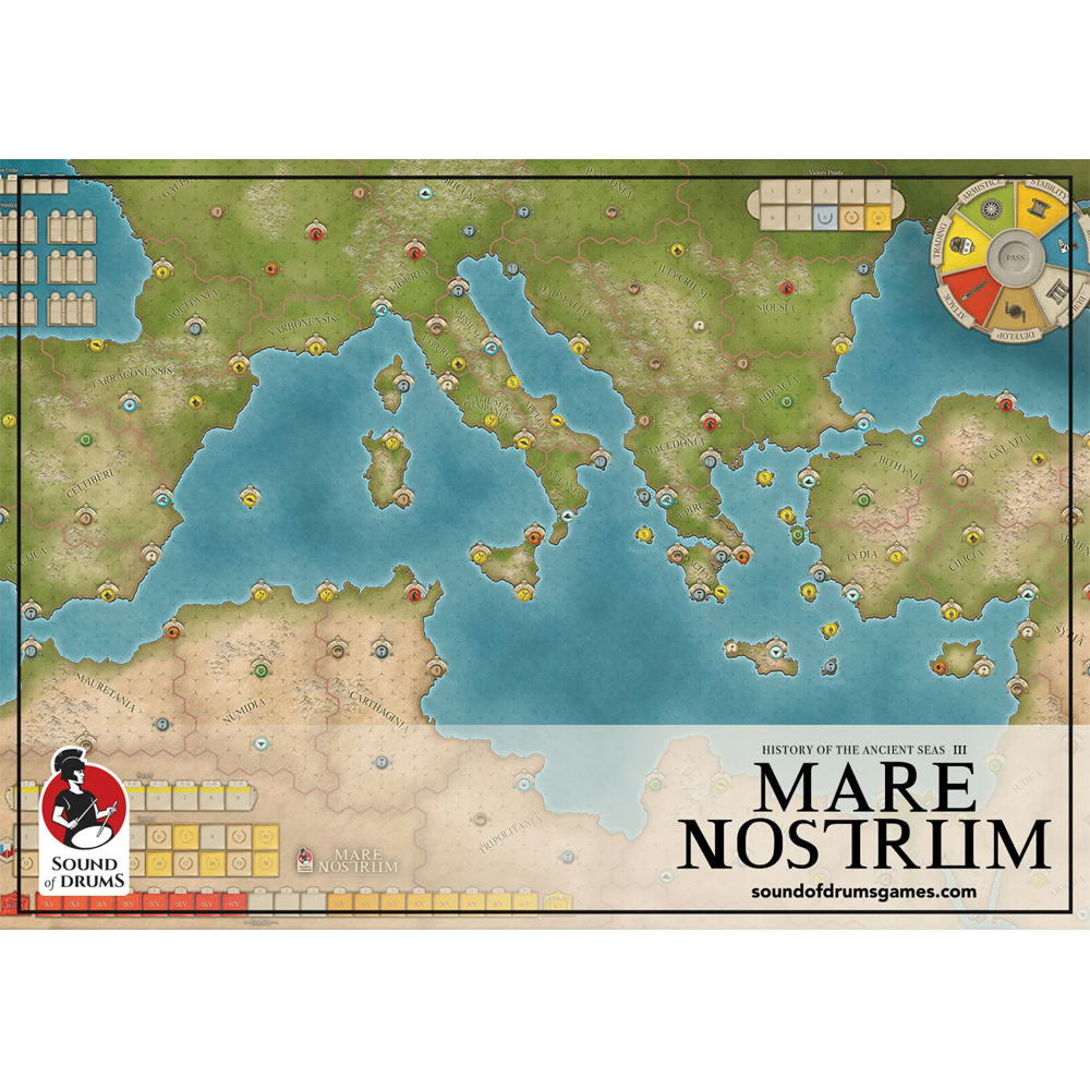 You will move your wooden meeples (representing legions, ships, armies and fleets) across a huge, beautiful illustrated map from the Iberic half island in the west to the Anatolian mountains in the east and Gallia in the north to the Nile Delta in the south.