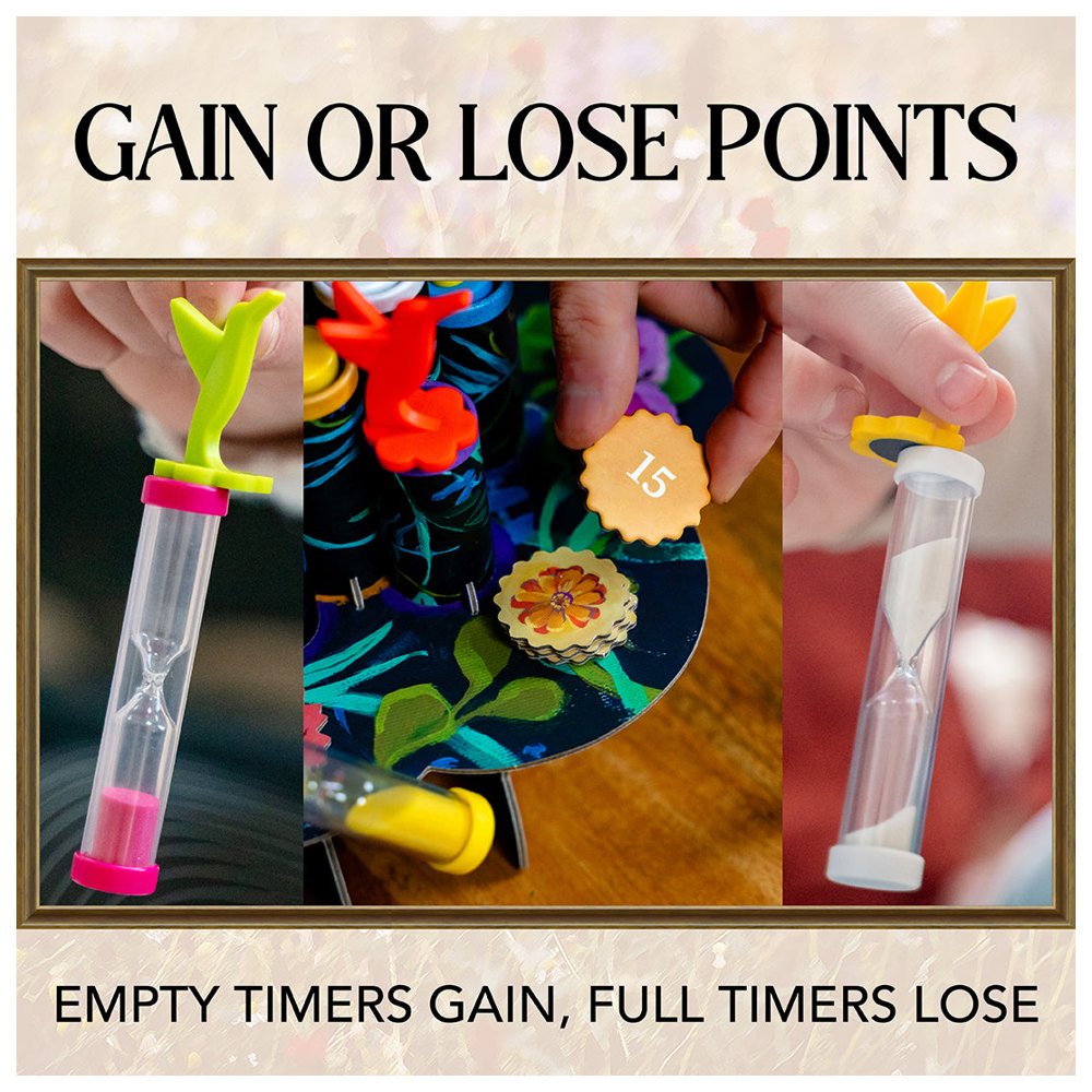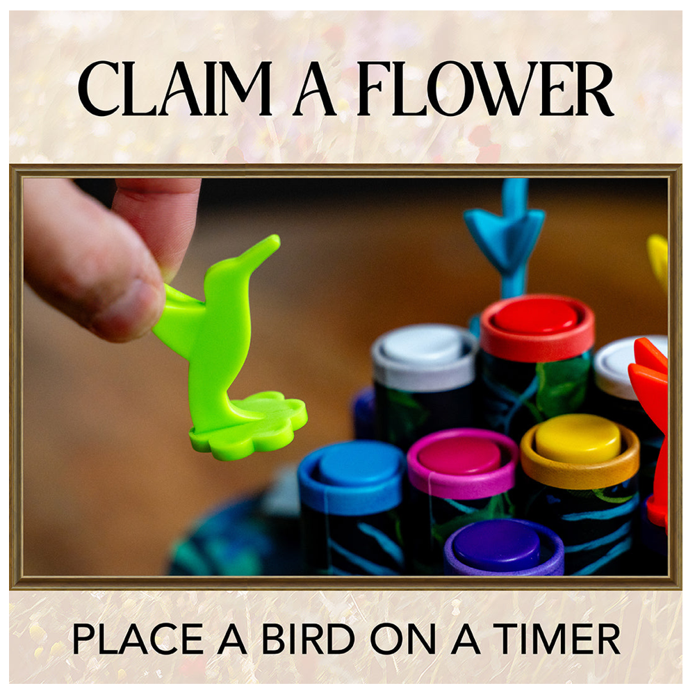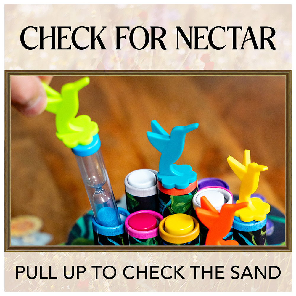 In Hummingbirds, players take turns claiming flowers atop hidden sand timers, maneuvering for better positions, and checking for nectar. If a sand timer beneath a flower has run out, you collect a nectar token - but if you check too soon, you'll lose one! The longer you wait, the greater the reward, but misjudging the timing could cost you.