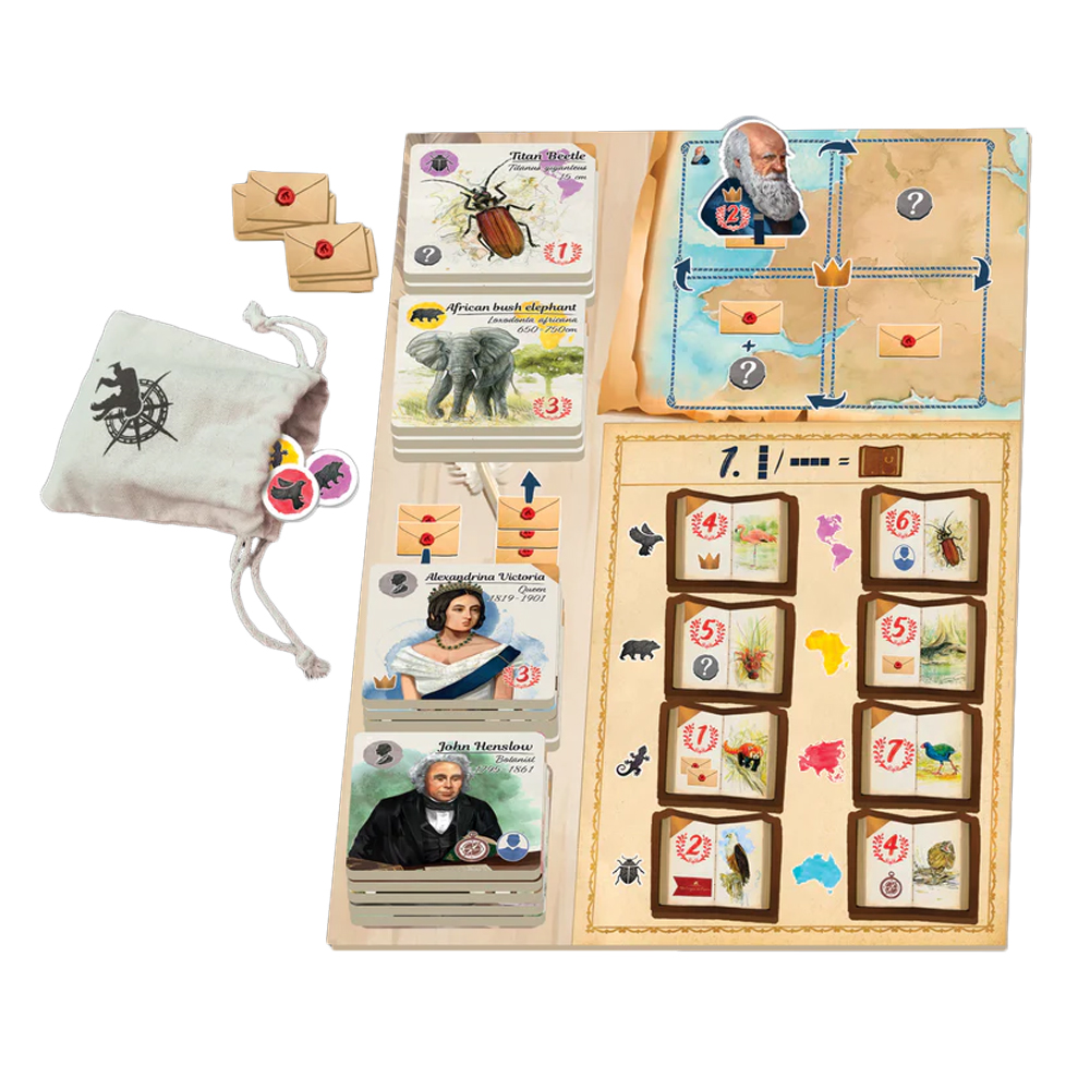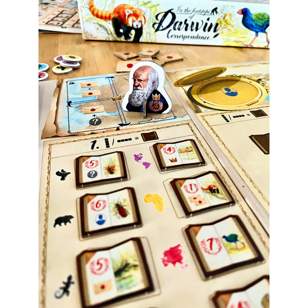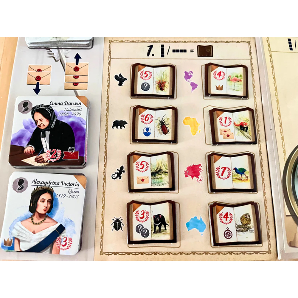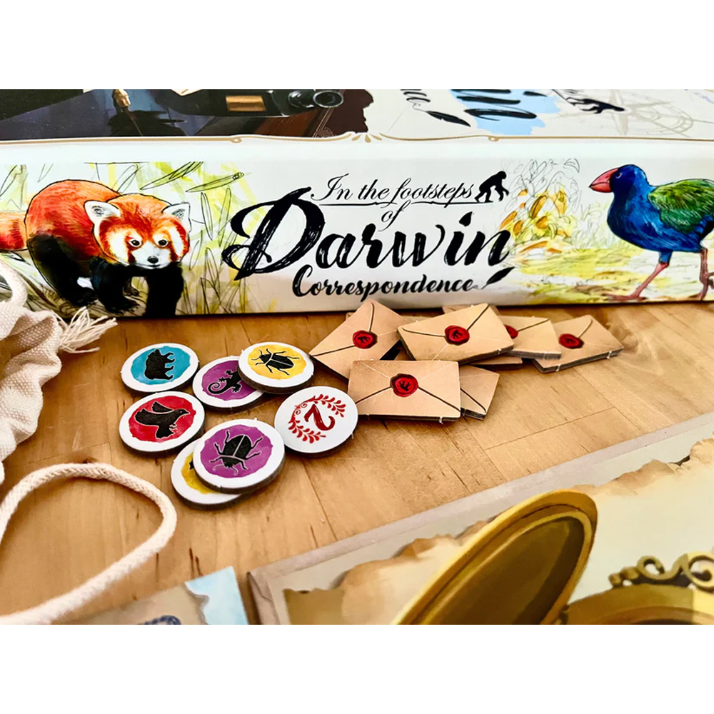 Correspondence Expansion adds several new features to the base game: new Publication tokens, classification tokens, envelope tokens and new characters, such as Emma Darwin and Queen Victoria.
