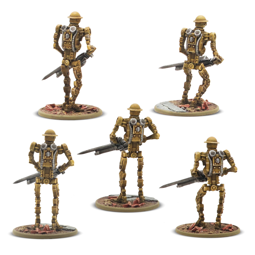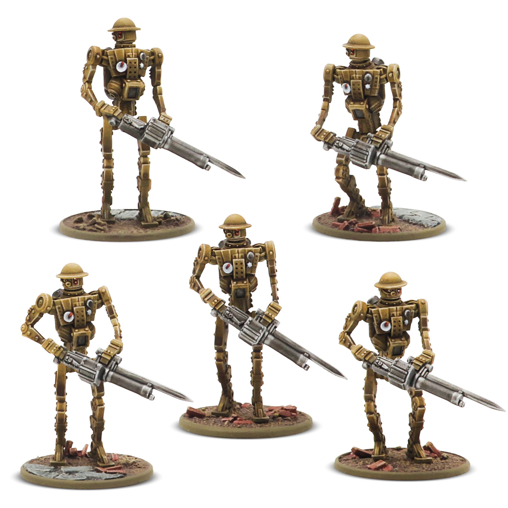 Central to this force is an Assault Platoon comprised of two squads of Automated Infantry, a Mk I squad laying down a heavy weight of fire thanks to their MMGs, supported and uplifted by their heavy Mk II cousins, whose mere presence nearby improves their accuracy. Both units are immune to the psychological horrors of war and are implacable in the face of defeat. They are well supported by a power-armoured squad of human Galahad infantry. A Platoon Commander, exclusive to this set, leads this platoon from the front, armed with a personal Tesla Rifle.