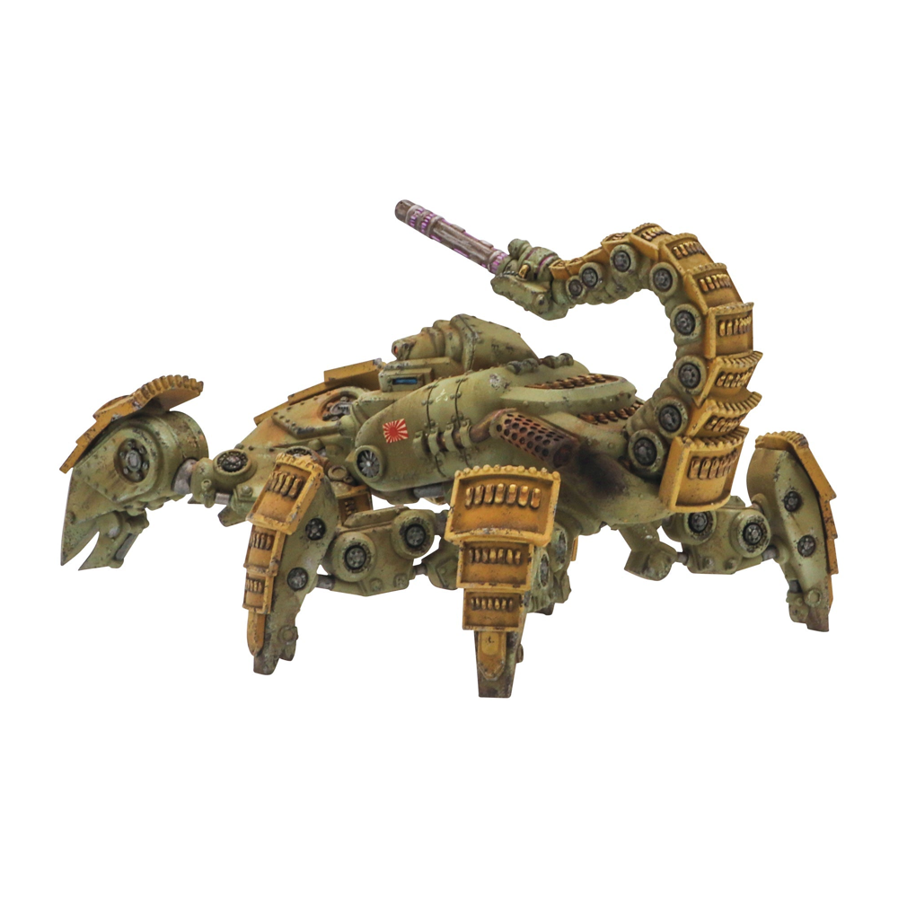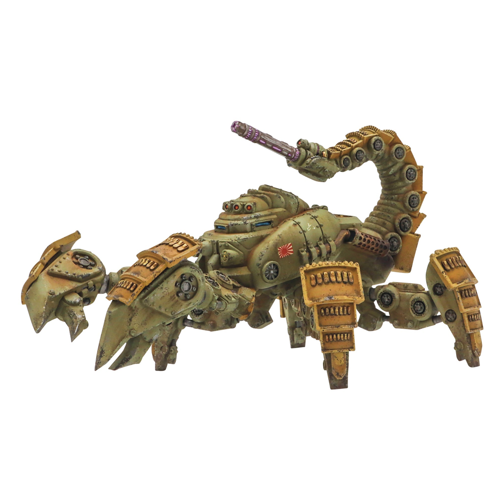 A Sasori Light Walker lends its support at the head of an Armoured Platoon, supplemented by a Chi-Ha tank that has been reequipped with a Shiboru Cannon of its own. The combined weight of all the Crush weapons available across both platoons should give any tabletop foe cause for concern.