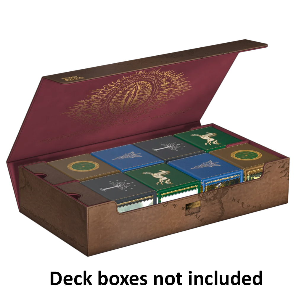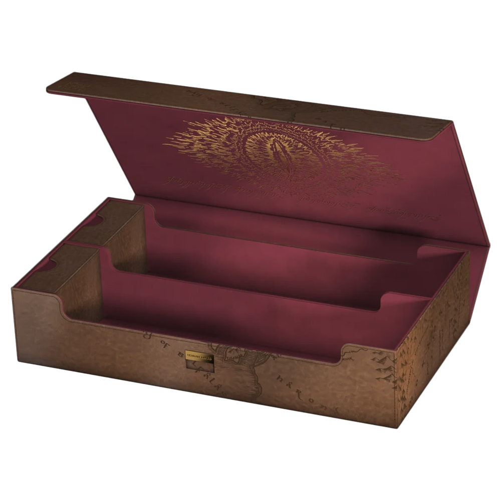 The Omnihive 1000+ is designed to hold multiple deck boxes, dice, and/or play-mats at once with the help of two flexibly positioned magnetic trays. The deck case from Ultimate Guard's official The Lord of the Rings edition "Places of Middle-Earth" is made of high-quality faux leather and is also the perfect choice for storing a larger collection of individual trading cards (up to 1000 double-sleeved).