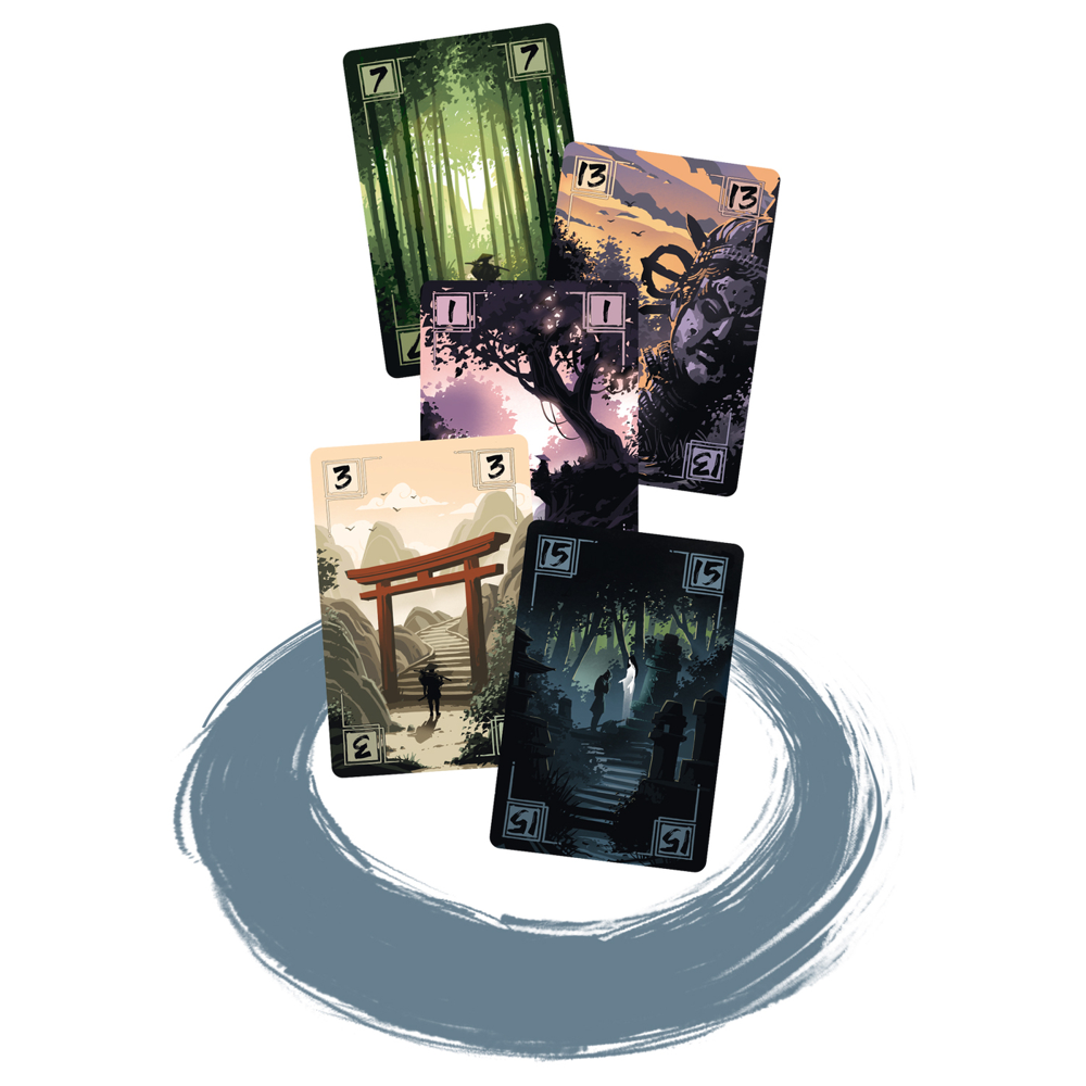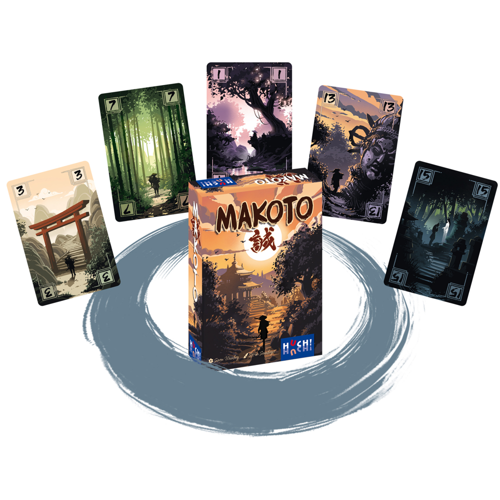 Makoto, which means "sincerity" in Japanese, is a climbing card game with hidden depths and beautiful illustrations that show the journey of a Ronin through the countryside of Japan. Each player starts a round with a hand of cards that range from 1-16, and a number of cards are dealt face up in the center of the table as a "blind".