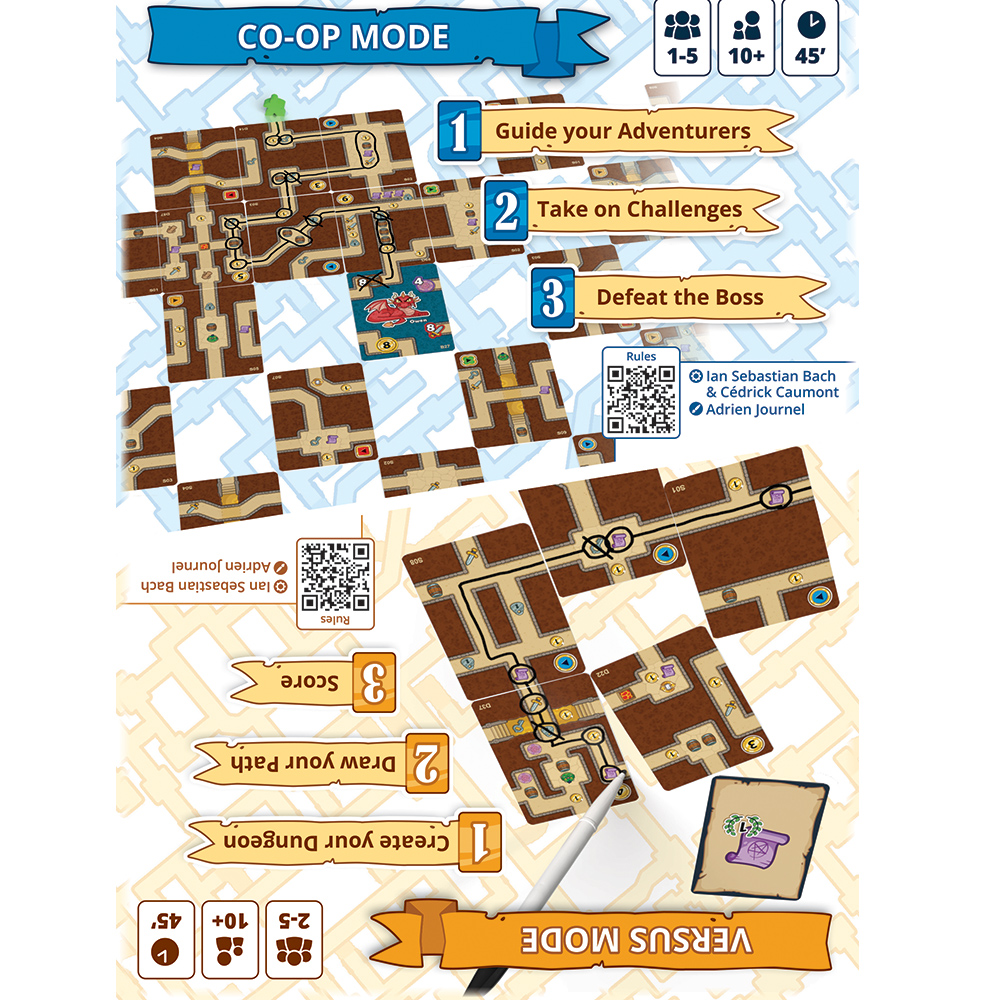 In Co-op Mode, Players will jointly manage groups of adventurers. In order to accomplish a mission, players should discuss strategy both before and during the game. After the setup and the market phase, players will explore the dungeon. In clockwise order, each player will place a card on an empty space of the tableau and draw a new card. Once a group mini can be connected to an objective, players should trace its path. When the mission requirements have been fulfilled, the game is won!