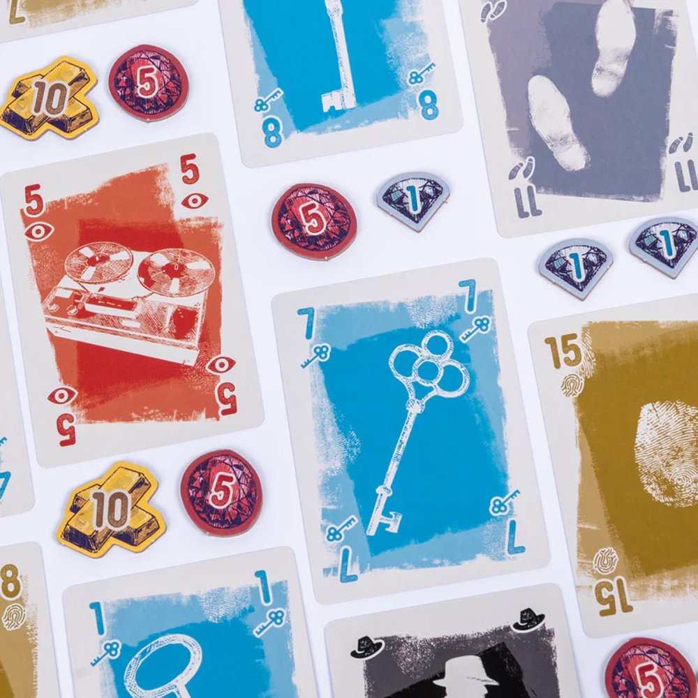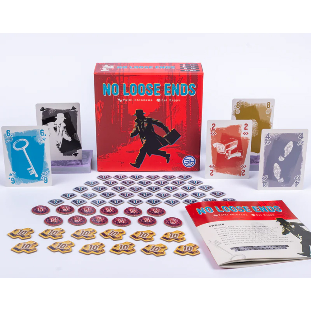 No Loose Ends is a trick-taking game in which players use cards from their hand to bid, carefully planning their heist. Winning tricks with the right suit or number will cover up the evidence in your bid and earn you points. Uncovered evidence and extra tricks not according to plan will lose you points for leaving loose ends from the robbery.