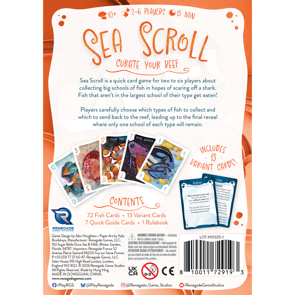 Sea Scroll is a quick card game for two to six players about collecting big schools of fish in hopes of scaring off a shark. Fish that aren't in the largest school of their type get eaten!