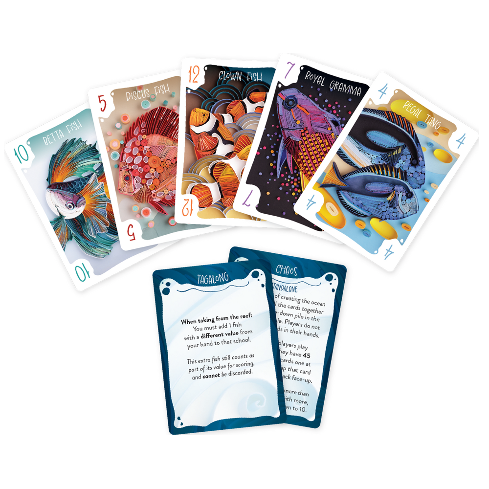 Players carefully choose which types of fish to collect and which to send back to the reef, leading up to the final reveal where only one school of each type will remain.