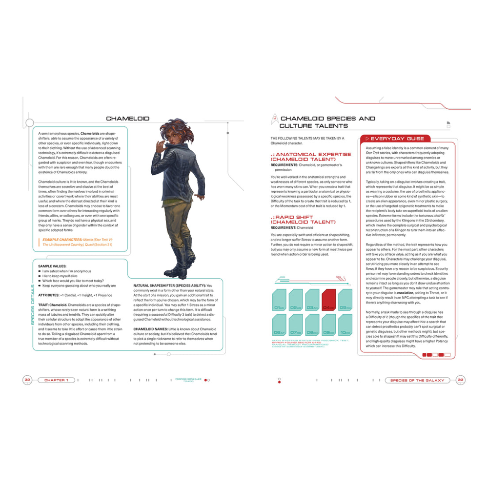 • Additional rules and insights on how to play a wide range of alien species, including androids, holograms, liberated Borg, mirror universe characters, and Vau N'Akat, as well as advice on using emotional states as traits.