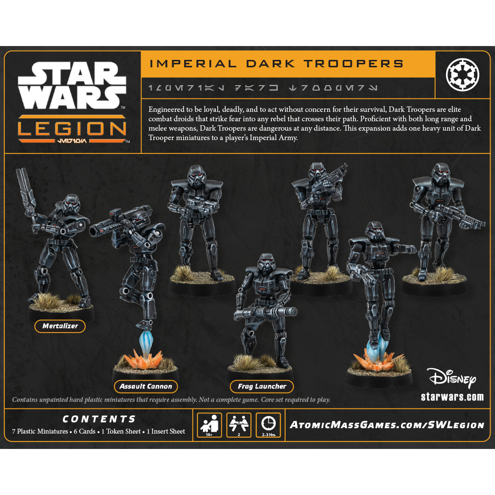 Engineered to be loyal, deadly, and to act without concern for their survival, Dark Troopers are elite combat droids that strike fear into any rebel that cross their path. Proficient with both long range and melee weapons, Dark Troopers are dangerous at any distance. This expansion adds one heavy unit of Dark Trooper miniatures to a player's Imperial Army.