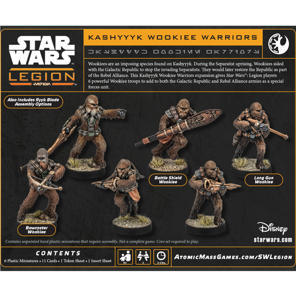 Wookiees are an imposing species found on Kashyyyk. During the Separatist uprising, Wookiees sided with the Galactic Republic to stop the invading Separatists. They would later restore the Republic as part of the Rebel Alliance. This expansion gives players 6 powerful Wookiee troops to add to both the Galactic Republic and Rebel Alliance armies.