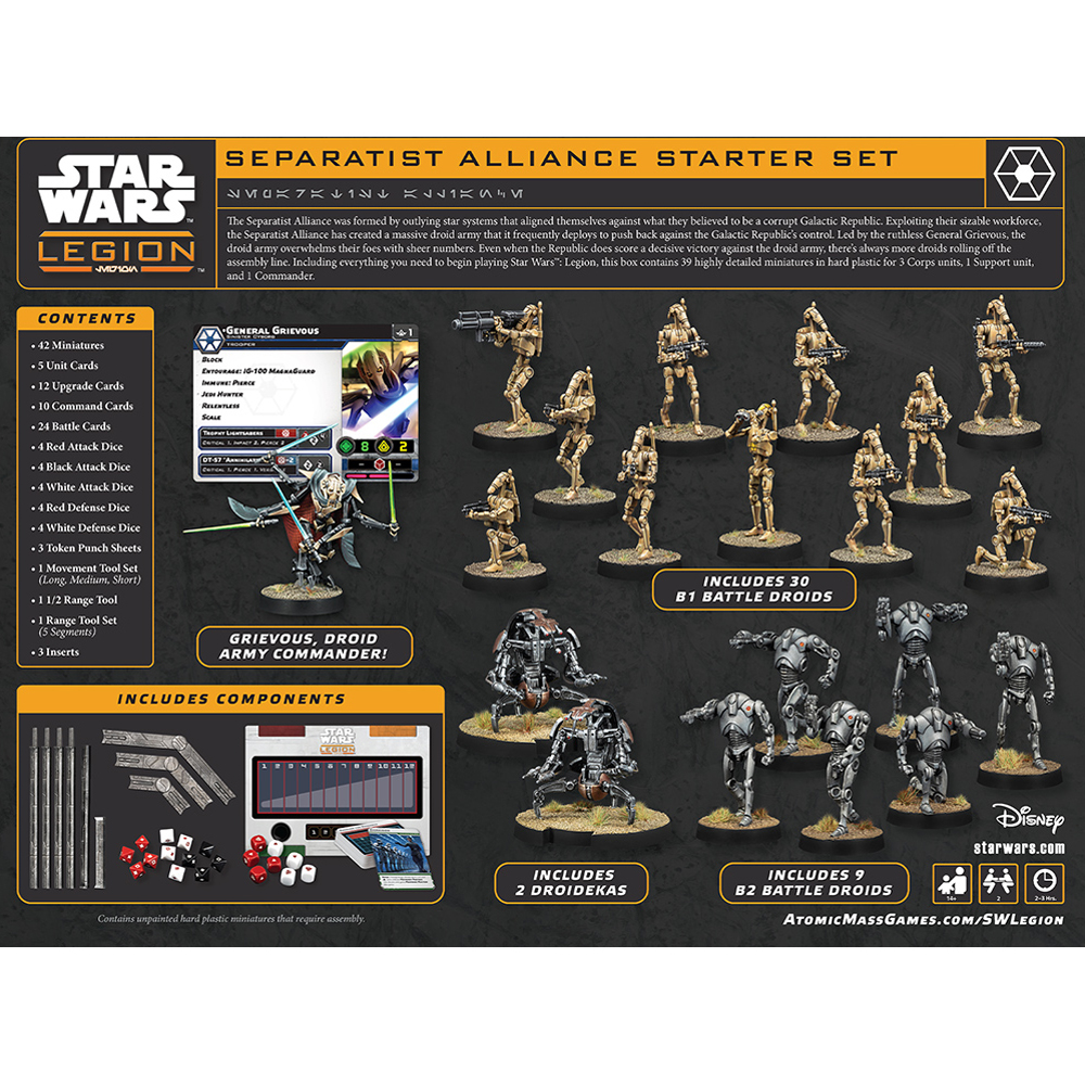 The Separatist Alliance was formed by outlying star systems that aligned themselves against what they believed to be a corrupt Galactic Republic. Exploiting their sizable workforce, the Separatist Alliance has created a massive droid army that it frequently deploys to push back against the Galactic Republic’s control. While these battle droids are not the most proficient fighters, the vast amount of them the Separatist Alliance is able to put onto the battlefield has made them a considerable threat to the Republic. The Separatist Alliance Starter Set contains a 600-point Recon-level army and all the dice, templates, tools, and tokens a player needs to begin playing their first games of Star WarsTM: Legion. When a player is ready for even bigger games, this starter serves as an ideal starting point for players to expand and customize their armies with additional units from other Star Wars: Legion unit boxes.