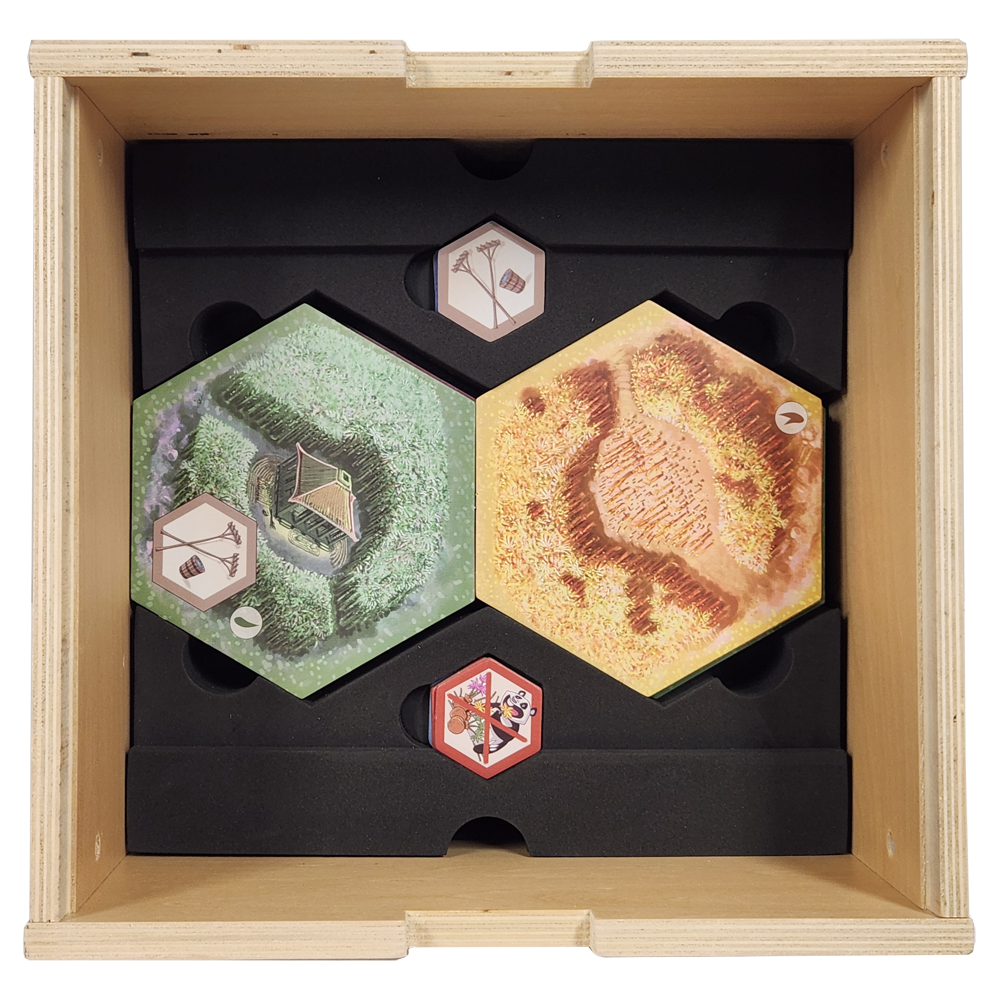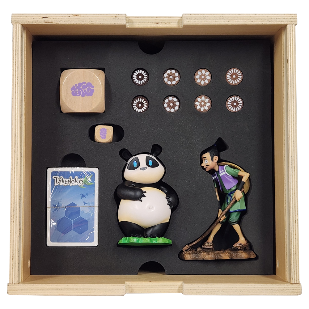 In Takenoko, the players will cultivate land plots, irrigate them, and grow one of the three species of bamboo (Green, Yellow, and Pink) with the help of the Imperial gardener to maintain this bamboo garden. They will have to bear with the immoderate hunger of this sacred animal for the juicy and tender bamboo. The player who manages his land plots best, growing the most bamboo while feeding the delicate appetite of the panda, will win the game.
