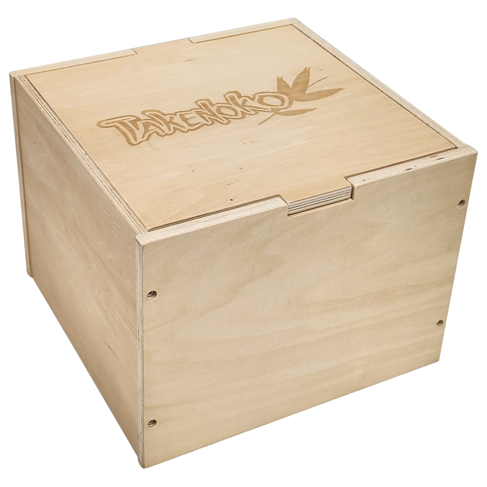 This Giant Edition comes in a wooden box and features larger components than the original version. The box is approximately 8.75 x 11.75 x 11.5 inches.