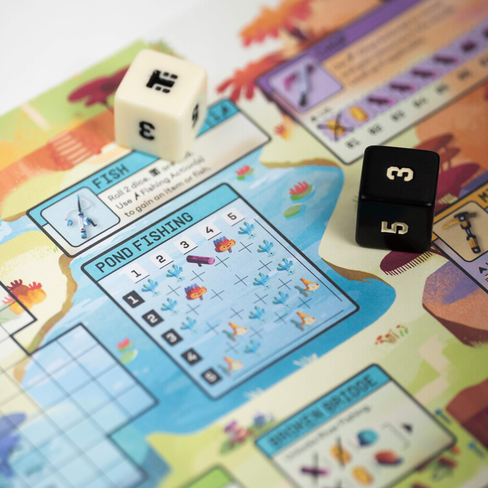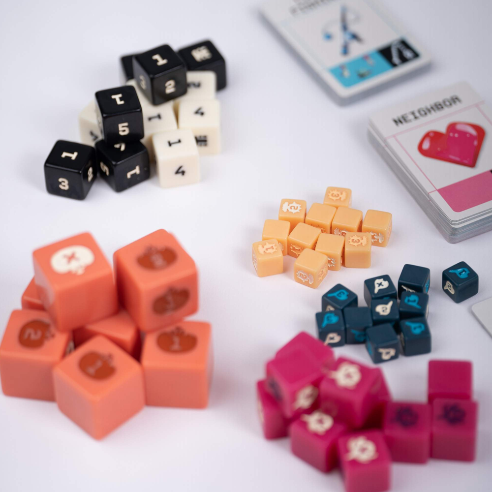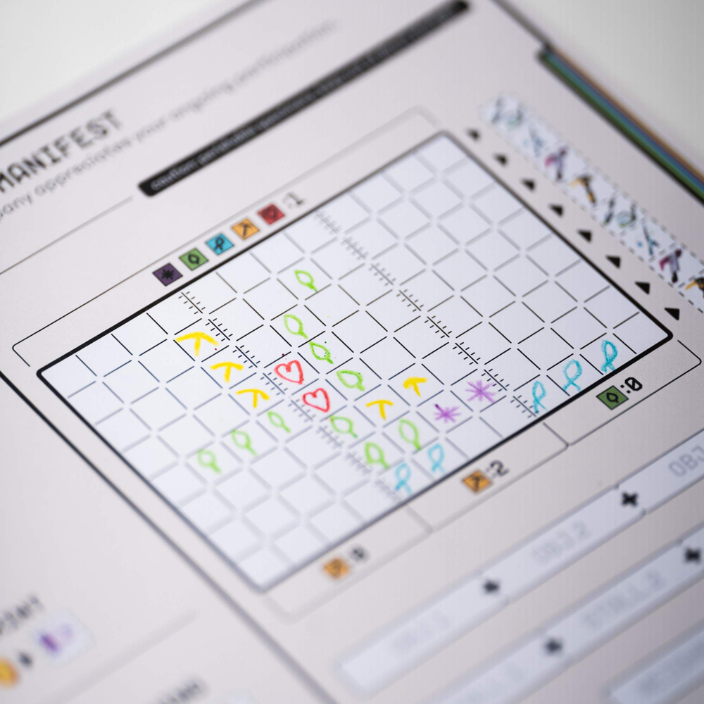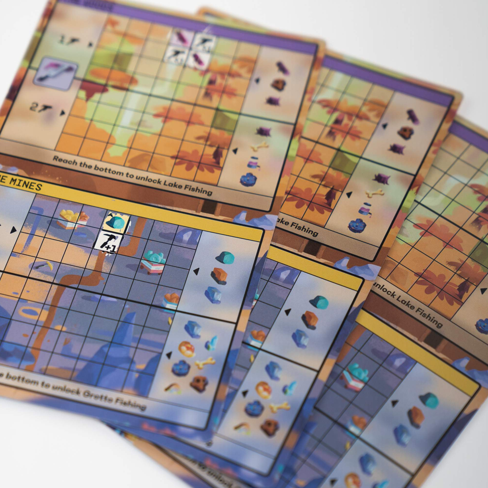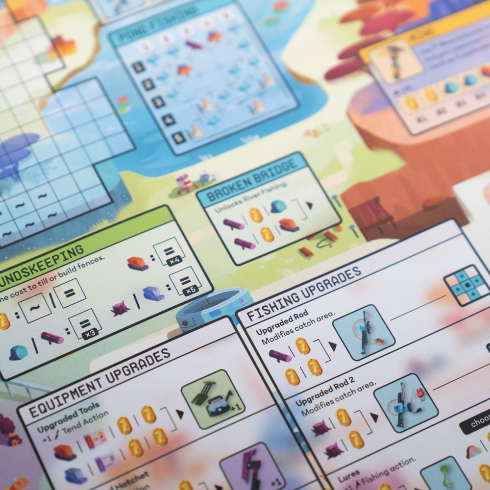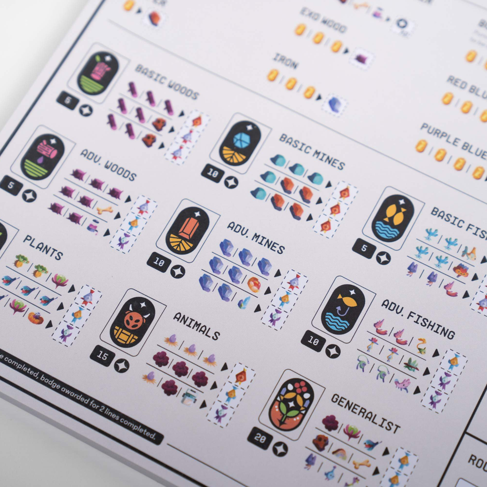 Tend is a "flip and write" game - well, technically, it's a flip-and-scratch-and-roll-and tick-and-stamp-and-write. In the game, players are each building up their own farm and collecting the greatest selection of goods to send back to Zenith HQ for research. All players will be using the same deck of task cards each round to take actions on their own sheets.