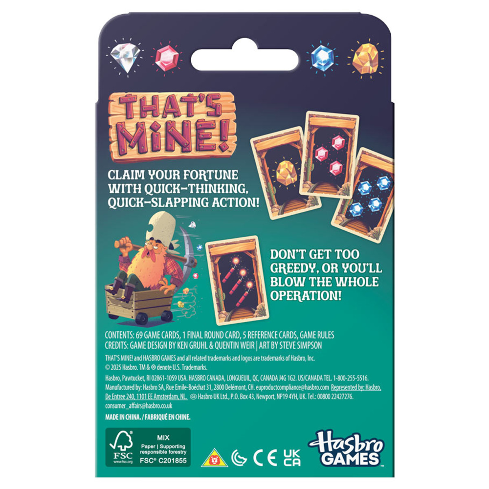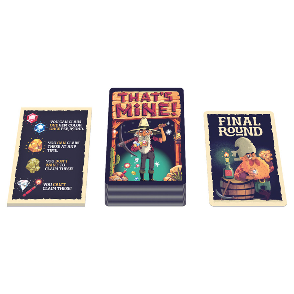 In That's Mine (aka Minero) players take turns flipping cards from the draw pile and placing them on the table. Be ready to think quick and slap fast if you want to claim the gems, gold nuggets, and diamond cards for yourself! But don't wait too long... if four sticks of dynamite are flipped, the mine will blow and wipe all the remaining treasure off the table! Once you've reached the end of the deck, the mine is empty and whoever claimed the most valuable objects wins!
