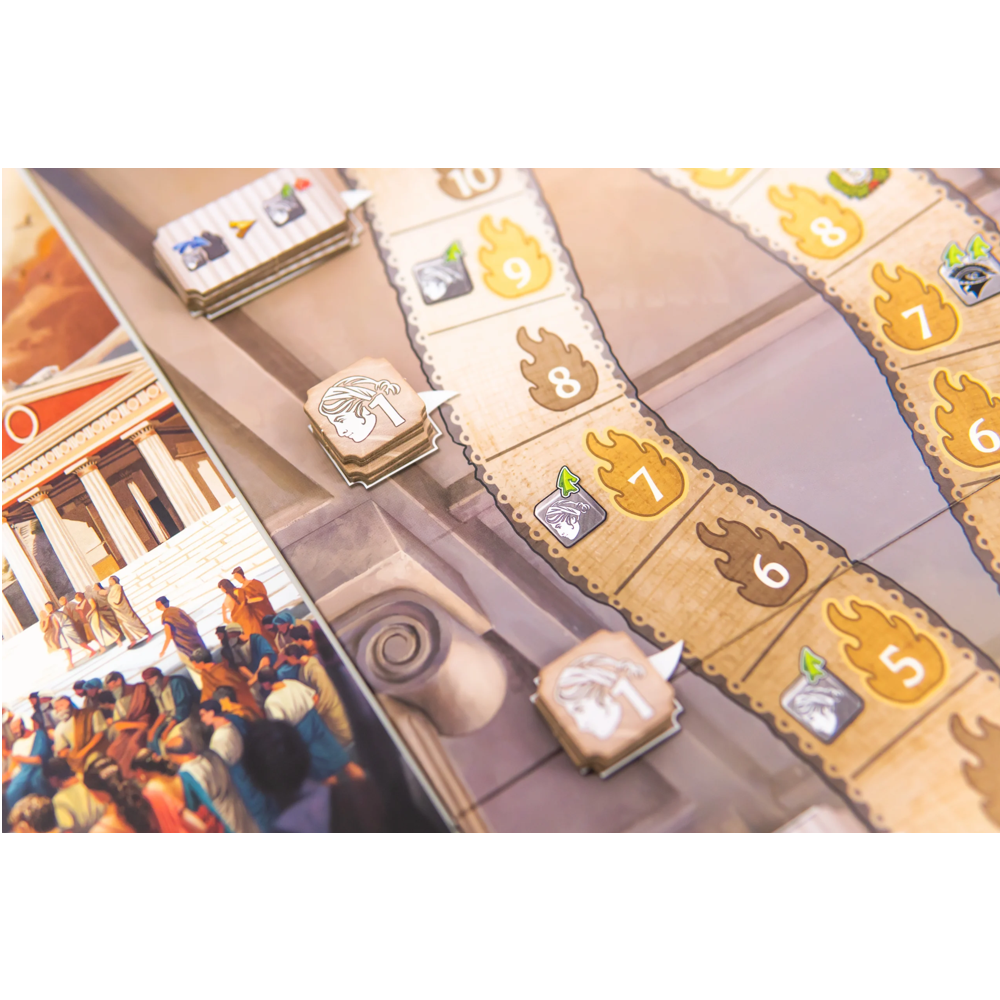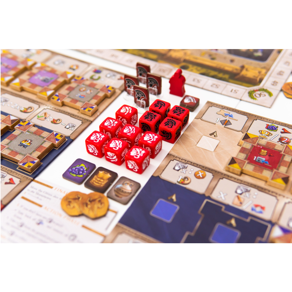 The game lasts 10 rounds, each divided into an Action phase and a Fate phase. During the Action phase, players use one Citizen die, and then move their Archon on the Cadmea. During the Fate phase, players may get additional scoring opportunities, depending on their accomplishments and for protecting the city gates. After final scoring the player with the most Victory Points is the winner.