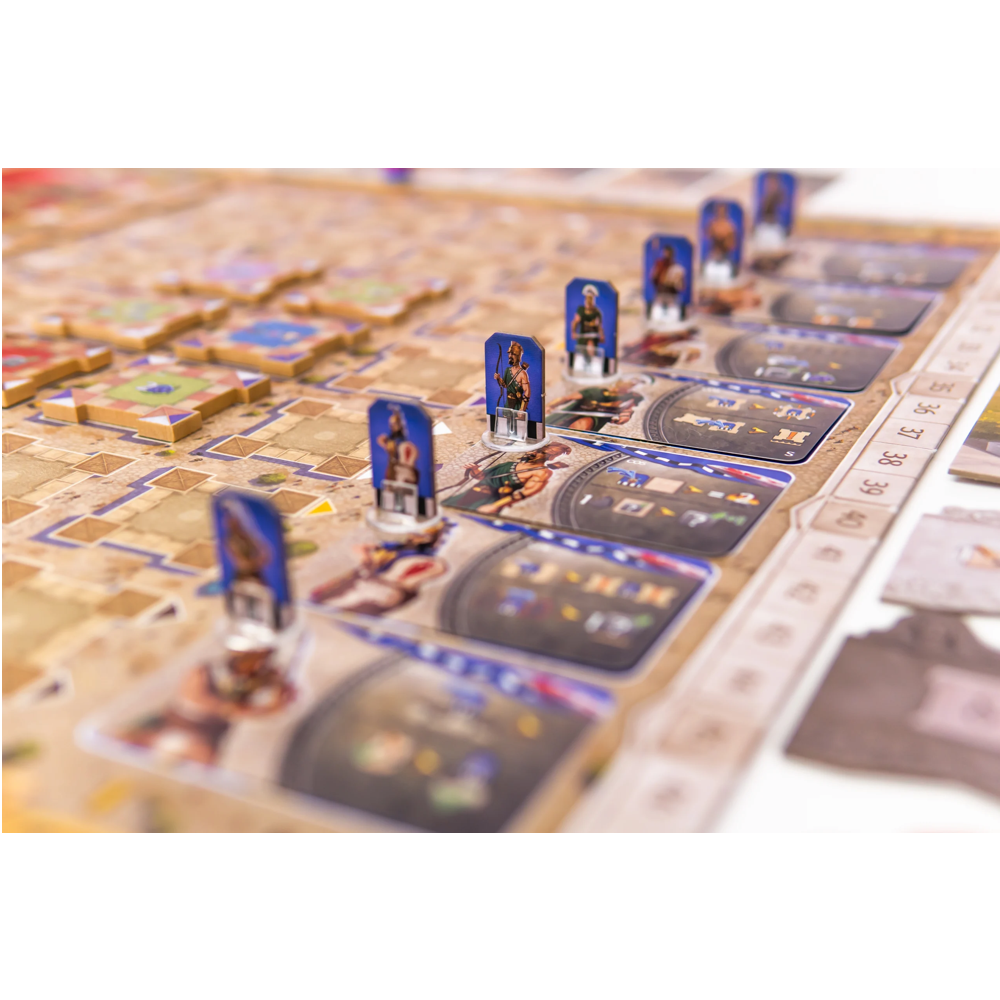 In Thebai, players assume the role of influential leaders from noble families during the tumultuous late Bronze Age. Throughout the game, players are tasked with rebuilding the Cadmea, the citadel of Thebes, while restoring the city's exports, praying to the gods of the city, and protecting the lives of the citizens as grand heroes spill each other's blood outside the gates.