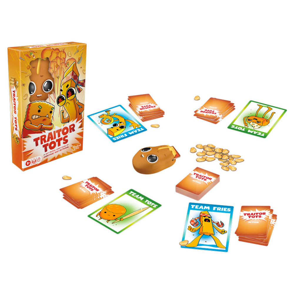 Take turns playing Action cards to steal Chips, switch teams, pass the Hot Potato, and more. Whenever someone plays a Nuke card, the player with the Hot Potato draws its bottom card. If they reveal the BOOM card, everyone on their team loses the round and anyone on the other team scores Chips. The player with the most Chips at the end of 3 rounds wins! Traitor Tots is a spudtacular, fast-paced game for kids and adults that livens up Family Game Night and get-togethers with best spuds.