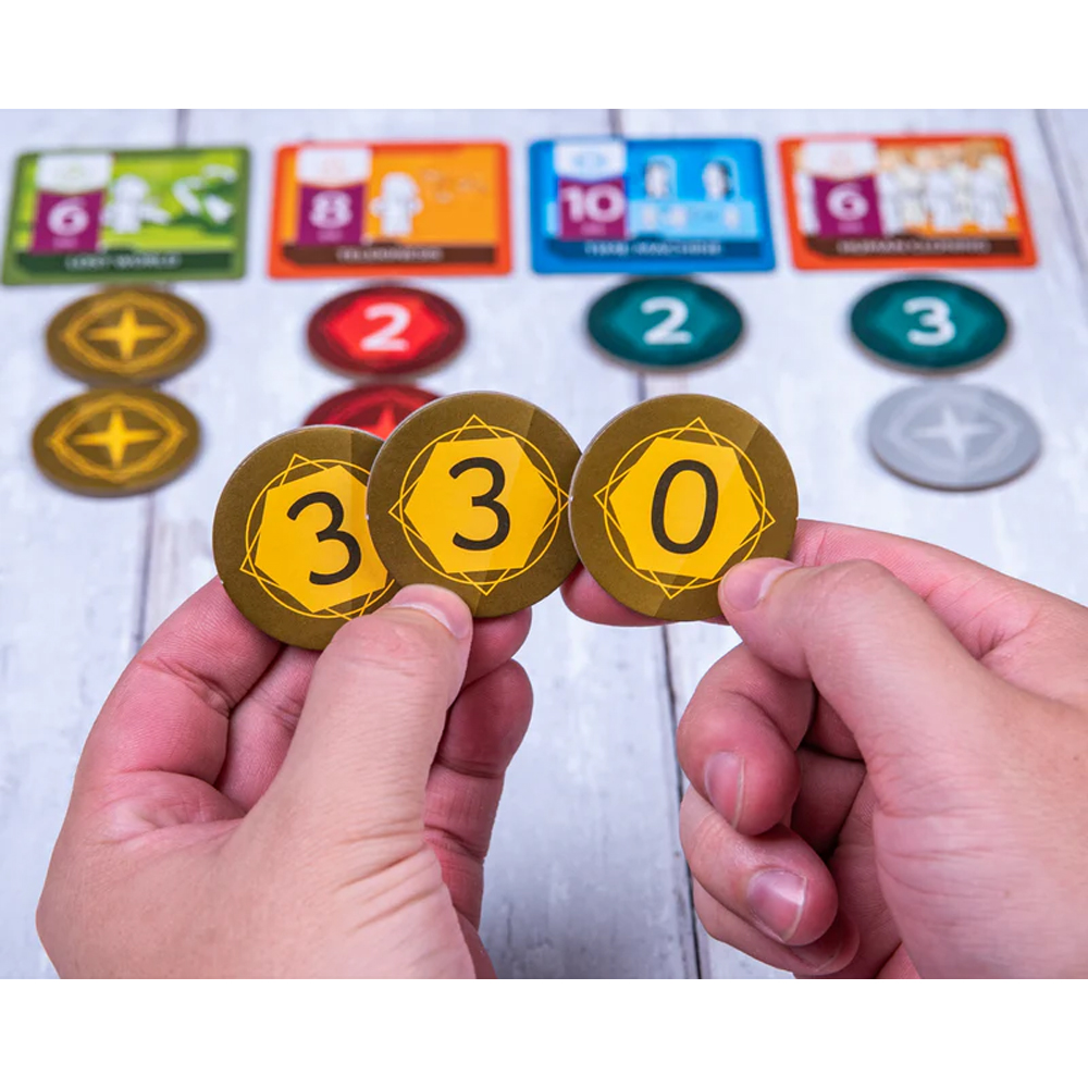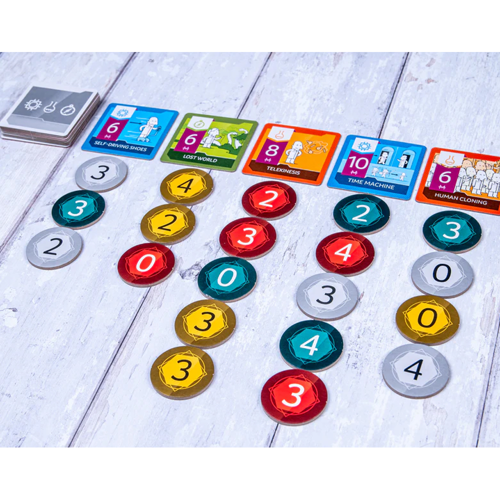 In each round, appealing but risky ventures rise. Sort out pessimistic or frothy ventures from the good ones and invest in them secretly. At the end of each round, reveal the secret biddings and see which ventures have earned enough investment. Investors who made the most noticeable investment in them will be rewarded for their contributions to its success. The investor with the most fame at the end of the game becomes the Venture Angel.