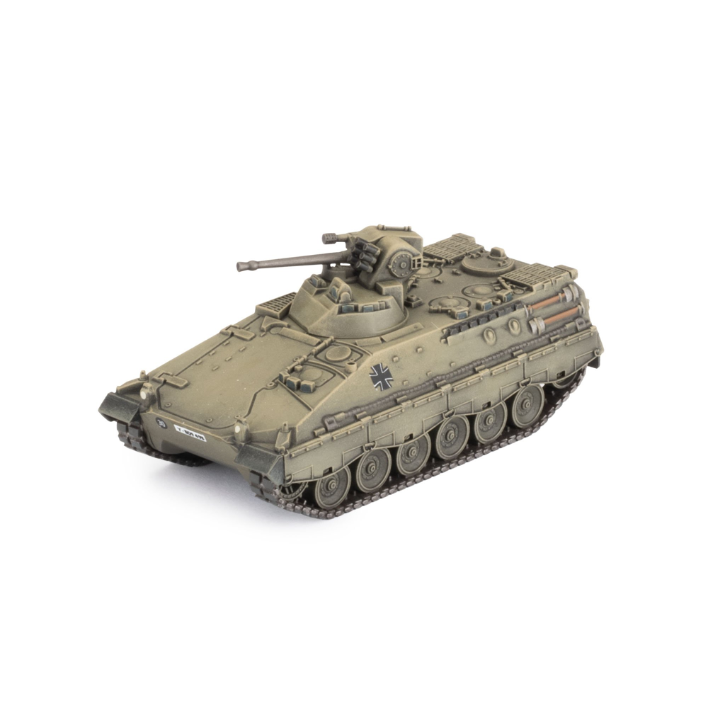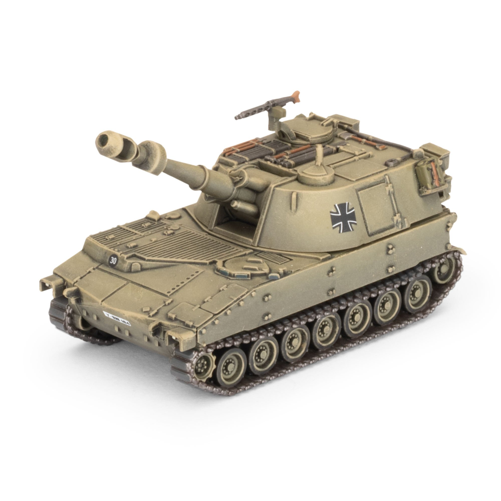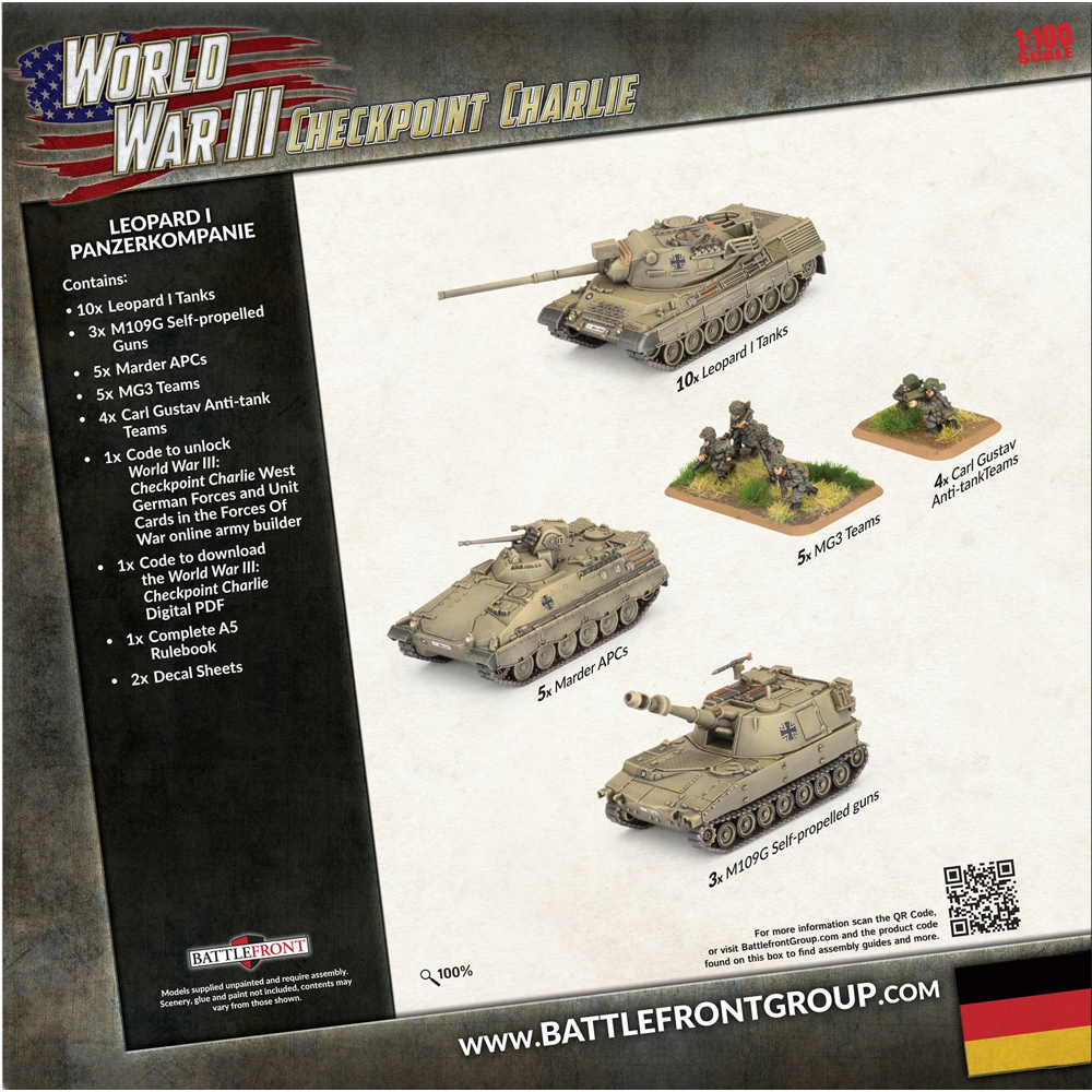 Jump straight into the Cold War gone HOT with this World War III: Checkpoint Charlie West German Starter Force. This Starter Force contains everything you need to begin collecting and playing a West German Force in WWIII: Checkpoint Charlie. Field an army right out of the box featuring Leopard tanks, M109G Self-propelled Guns, MG3 Team, and more.