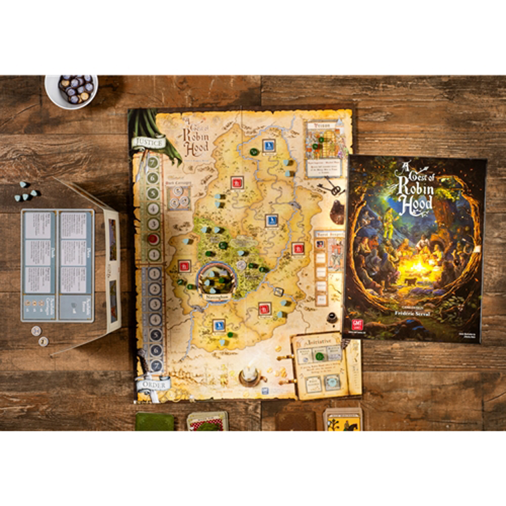 A Gest of Robin Hood is a board game that presents a complex figure - a social bandit leading an insurrection against the Sheriff of Nottingham. Here, Robin Hood isn't just an outlaw, he is a guerrilla fighter struggling for justice in a medieval England that is on the cusp of becoming a modern state. In this game, two players assume the asymmetric roles of Robin Hood and the Sheriff, leverage event cards and unique action menus in pursuit of competing visions for the future of Nottinghamshire: justice for the common folk or order imposed from above.